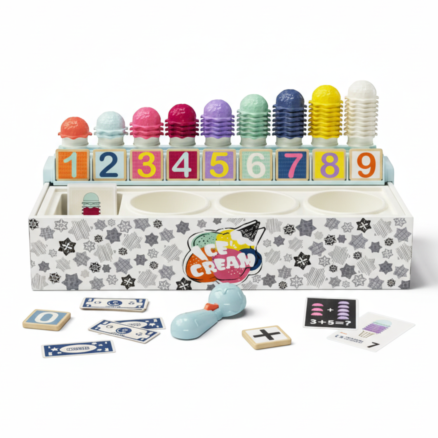 Cztery gałki lodów malinowych i pięć gałek waniliowych? Już się robi! Z edukacyjnym zestawem od TOPBRIGHT, nauka stanie się prawdziwą przyjemnością, a dzieci wcielą się w role dorosłych i nauczą liczyć.