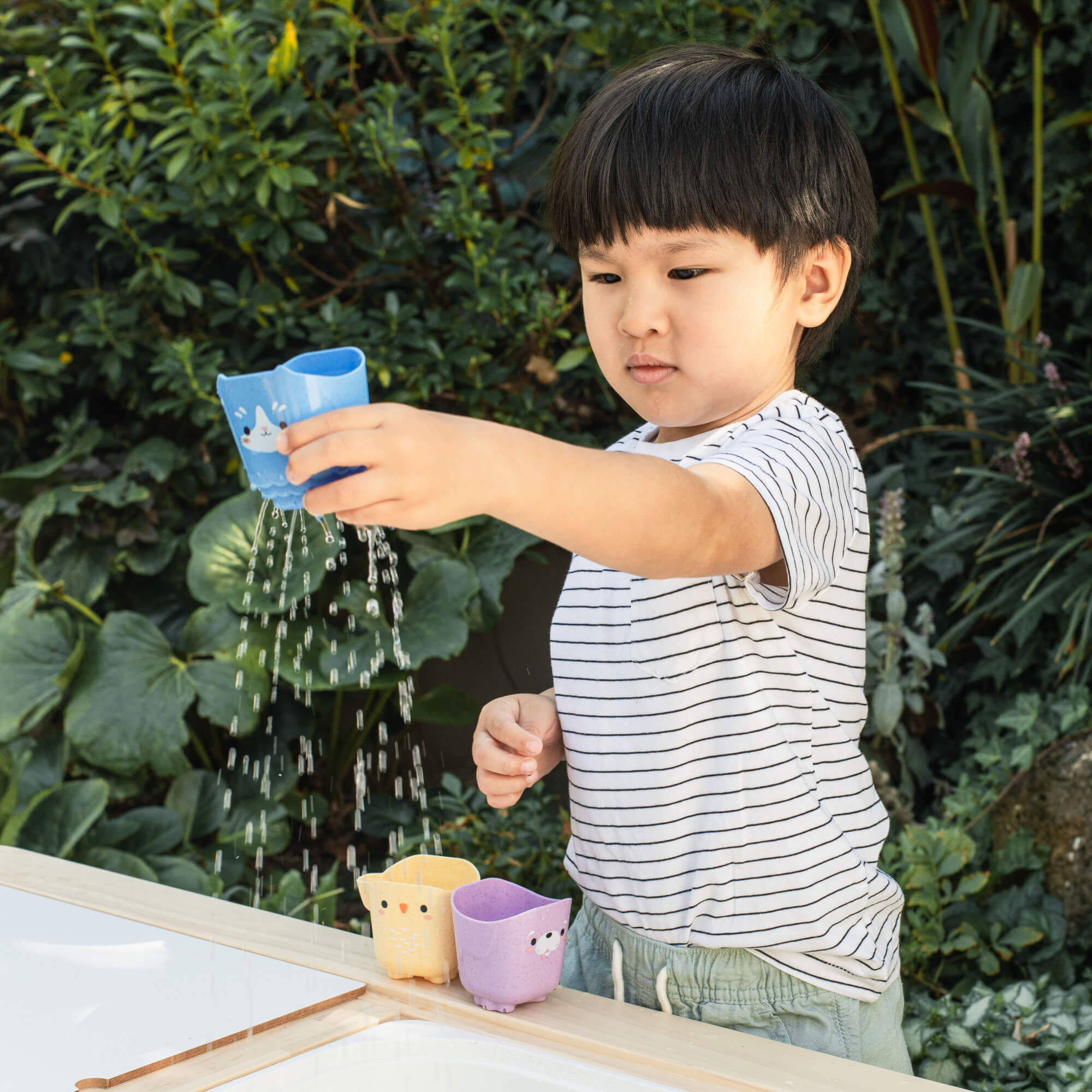 Dzieci uwielbiają przelewanie wody, więc te urocze zwierzątka na wyjątkowych, kolorowych kubeczkach kąpielowych zapewnią im wiele radości. Niezależnie od tego, czy jest to zabawa w błotku i wodzie na świeżym powietrzu, czy też wieczorna kąpiel, sprytnie skonstruowane kubeczki kąpielowe oferują godziny zabawy. Zabawkę można składać, rozkładać, sortować, a także obserwować jaki kształt ma woda przelewana przez każdy z elementów (każda część układanki ma unikalny wzór otworów). Każdy kubeczek jest wyposażony w przyssawki, dzięki czemu dzieci mogą przymocować te zabawki do wanny, ścian łazienki i szklanych powierzchni. Produkt tanowi świetne uzupełnienie pozostałych zabawek kąpielowych od Tiger Tribe. Produkt wykonany z bioplastiku, jest częścią serii ECO.