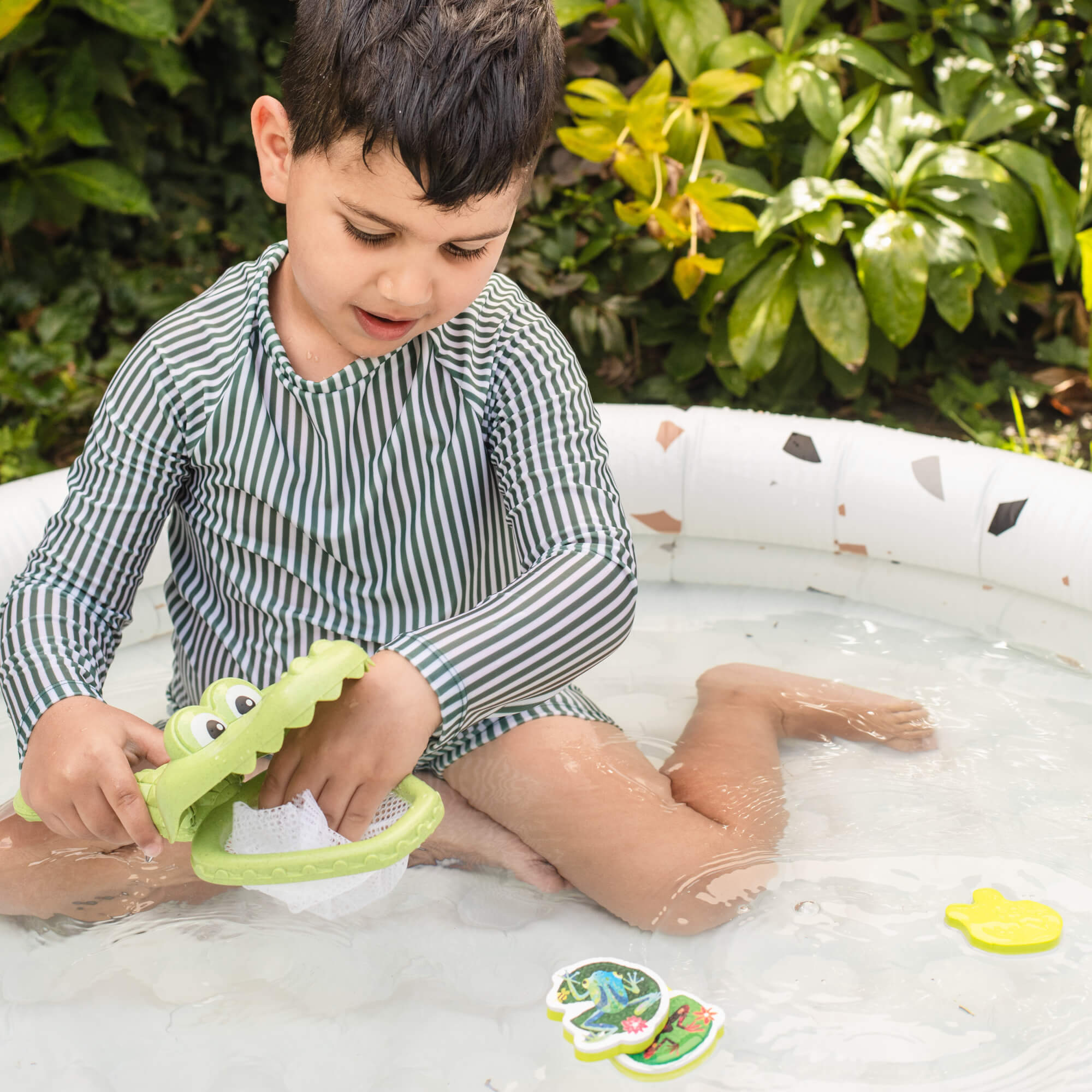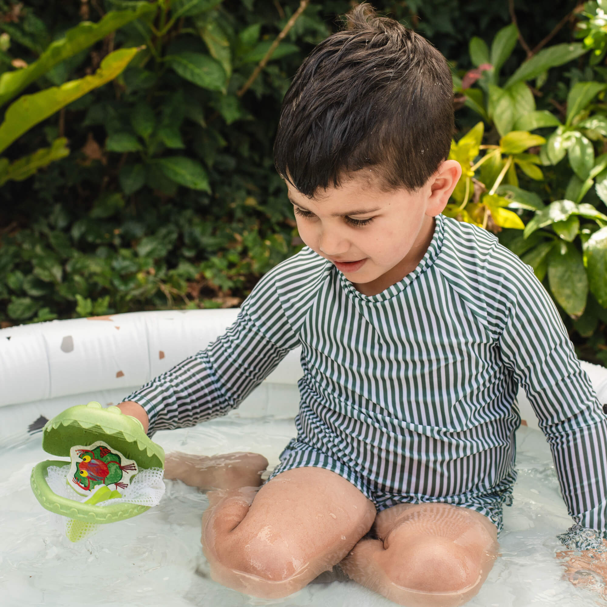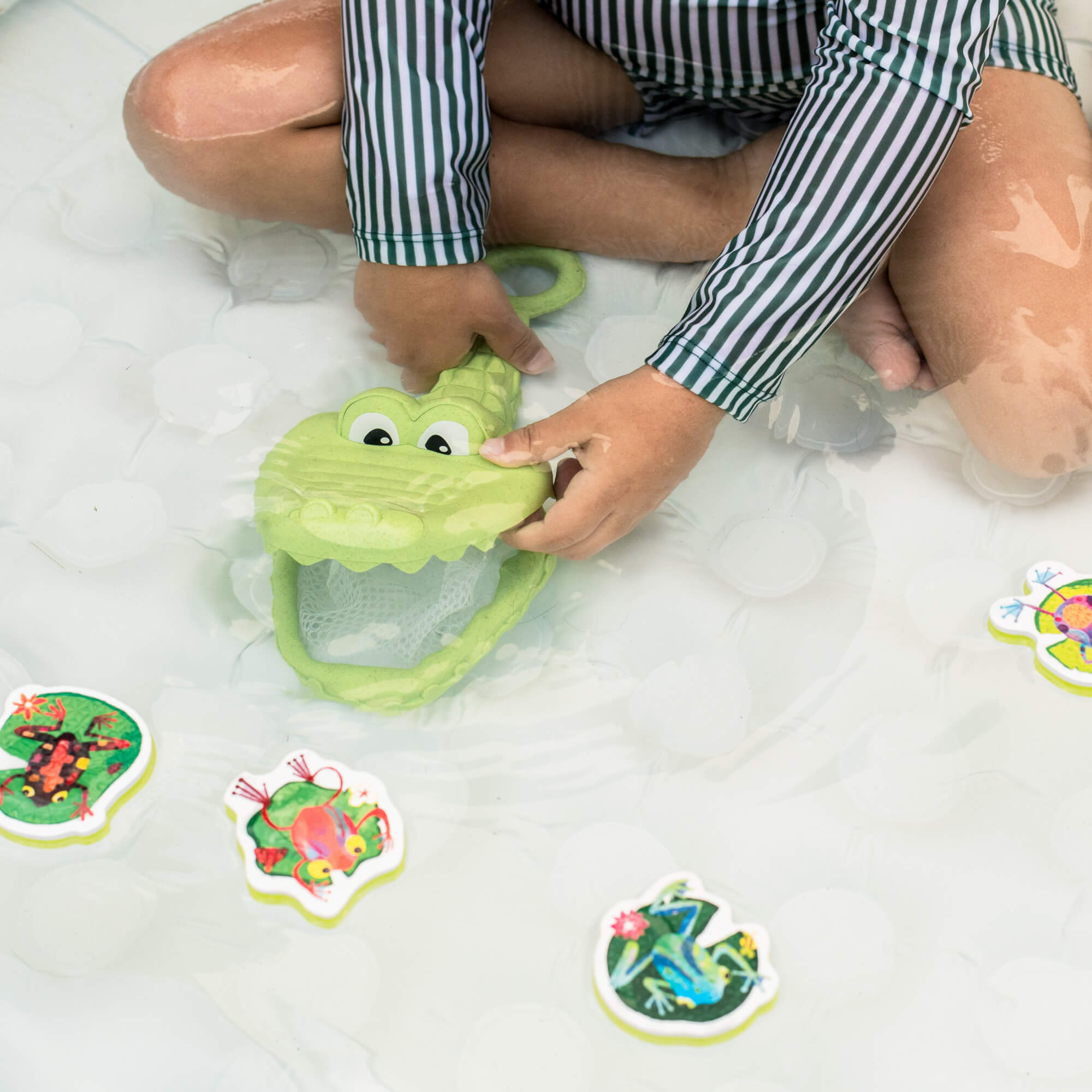 Siatka w kształcie krokodyla służy do łowienia piankowych żabek unoszących się na powierzchni wody. Gwarantuje świetną zabawę w przeszukiwanie wanny w poszukiwaniu jaskrawo kolorowych, ilustrowanych piankowych żabek. Zabawka pomaga rozwijać umiejętności motoryczne, siłę chwytu i koordynację ręka-oko, gdy maluchy ćwiczą chwyt na przyjaznej dla dzieci rączce. Produkt wykonany z bioplastiku, jest częścią serii ECO.