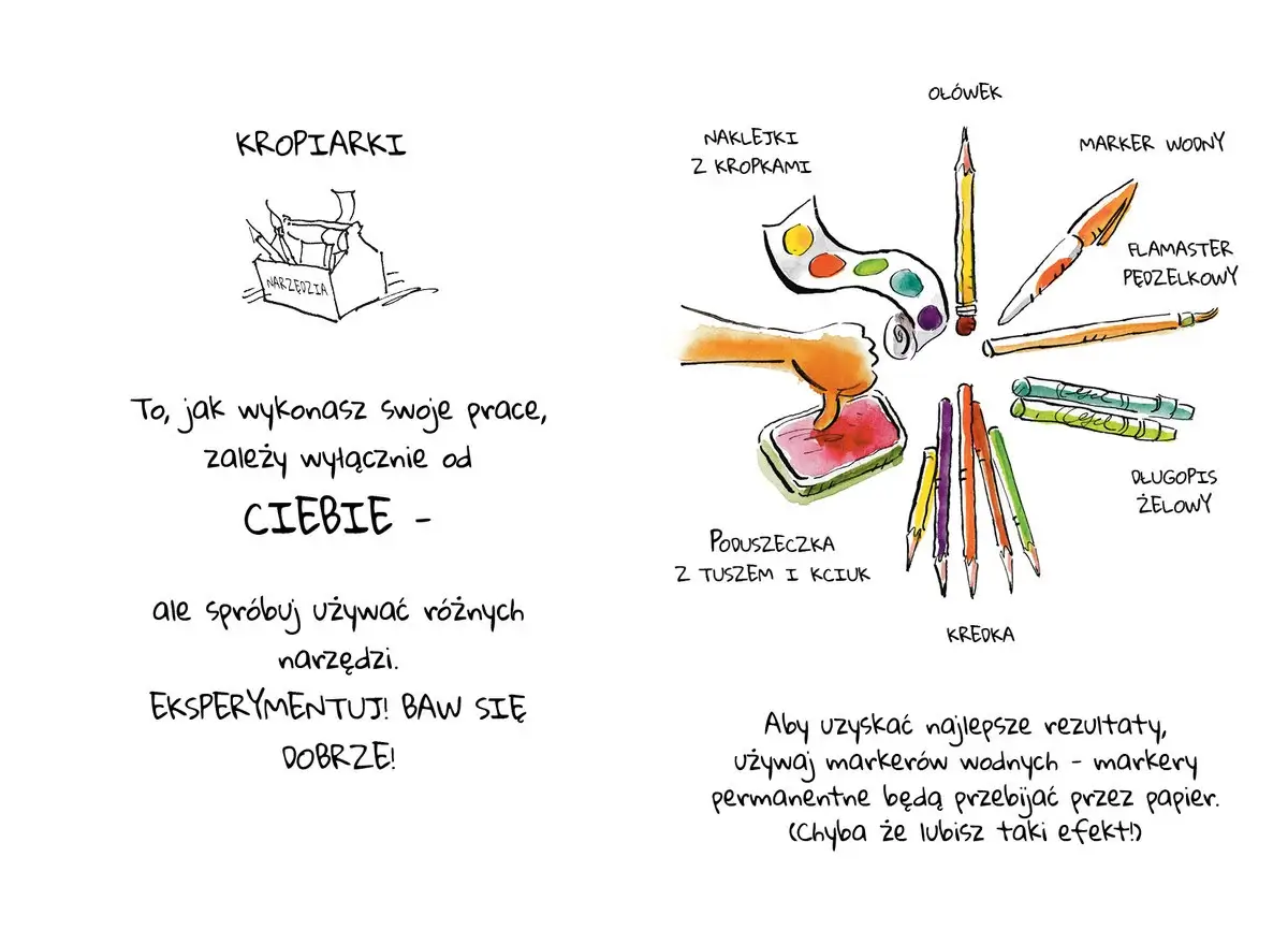 Na kolejnych stronach narysujesz jedną kropkę, podpiszesz się, a później… Kropki małe i duże, uporządkowane i rozproszone, kropki zakręcone i proste, włochate i kraciaste. Użyjesz ołówka, flamastra, a nawet własnych palców!