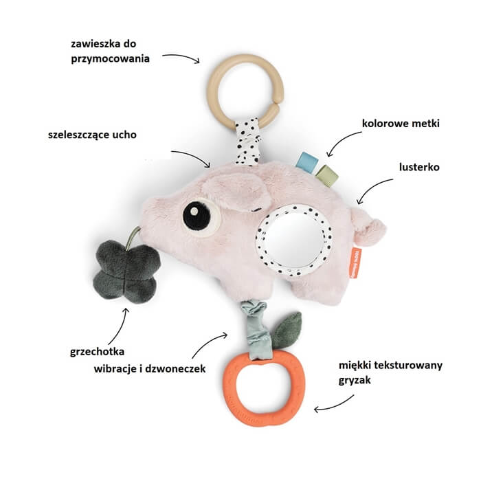 Grzechotką, dzwoneczkiem i szeleszczącymi dźwiękami stymuluje słuch i dotyk, a lusterko zachęca malucha do odkrywania swojego odbicia. Pociągnięcie gryzaka w kształcie jabłka uruchamia zabawny efekt wibracji, dodając odrobine więcej radości do zabawy.