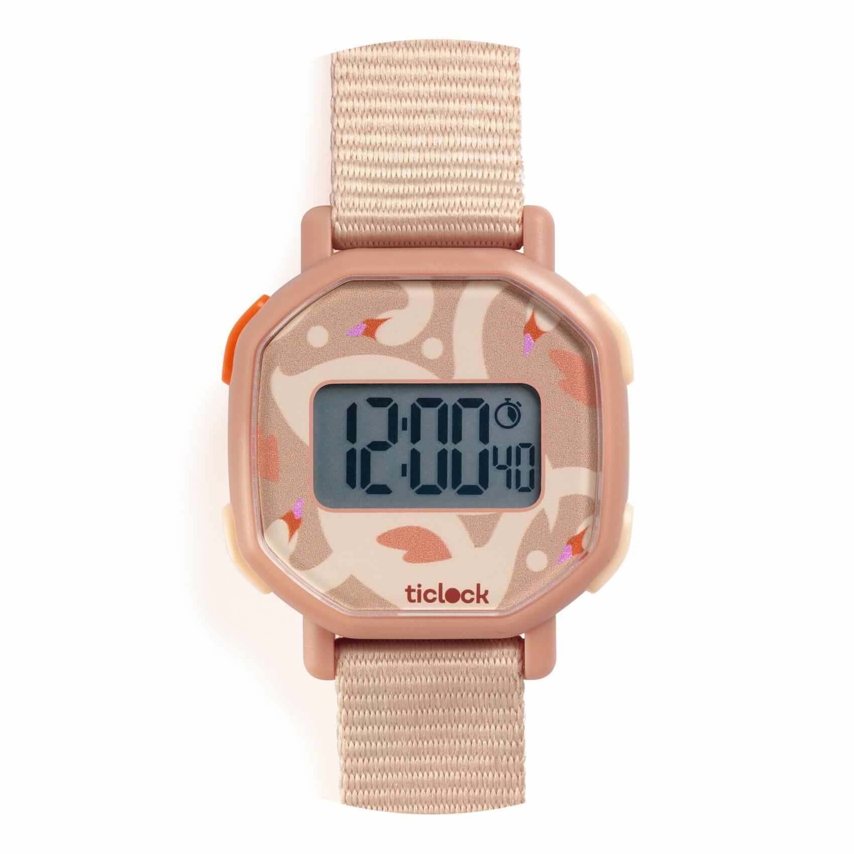 Na wyświetlaczu pojawiają się godziny, minuty i sekundy. Zegarek posiada funkcję stopera. Wodoodporny do 5 barów. Zawiera wbudowaną baterię SR626SW. Posiada wstrząsoodporną obudowę. Beżowy pasek z wytrzymałego materiału posiada regulację.
