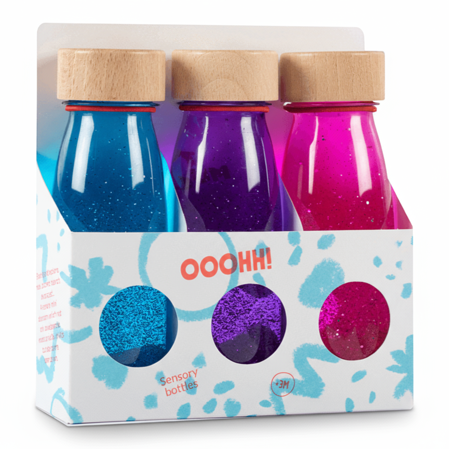 Zestaw składa się z 3 butelek sensorycznych: Float - Niebieskiej, Różowej oraz Fioletowej.