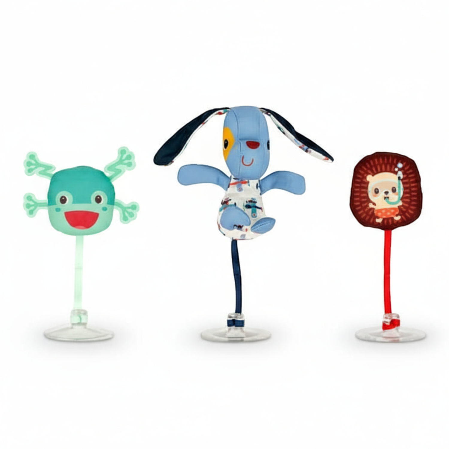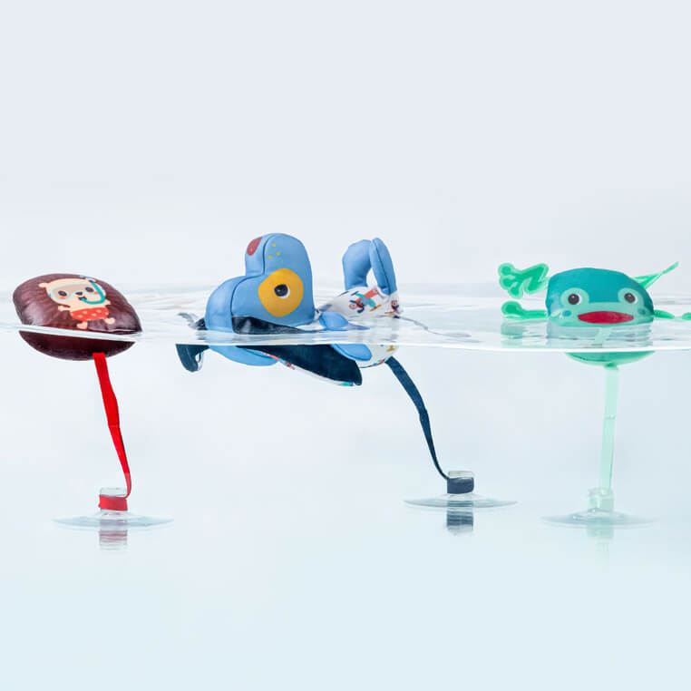 Wykonane są z miękkiego, łatwego do czyszczenia i szybkoschnącego materiału. W skład zestawu wchodzą: Piesek Jules, Jeżyk Leon oraz żabka. Dzięki przyssawkom można je zamocować do dowolnej płaskiej powierzchni, np. dna wanienki, dzięki czemu dryfują w miejscu pod wpływem ruchów wody. Zabawka jest perfekcyjnie wykończona, z dbałością o każdy szczegół i w pełni bezpieczna dla dziecka. Umila czas spędzony w kąpieli, a przy okazji stymuluje sensorycznie (wystające elementy, np. długie uszy psa, żabie łapki), rozwija sprawność motoryczną (chwyt, przyczepianie i odczepianie), logiczne myślenie (dostrzeganie związków przyczynowo-skutkowych) oraz wyobraźnię (snucie opowieści).