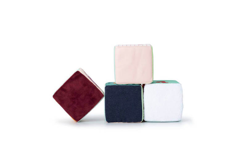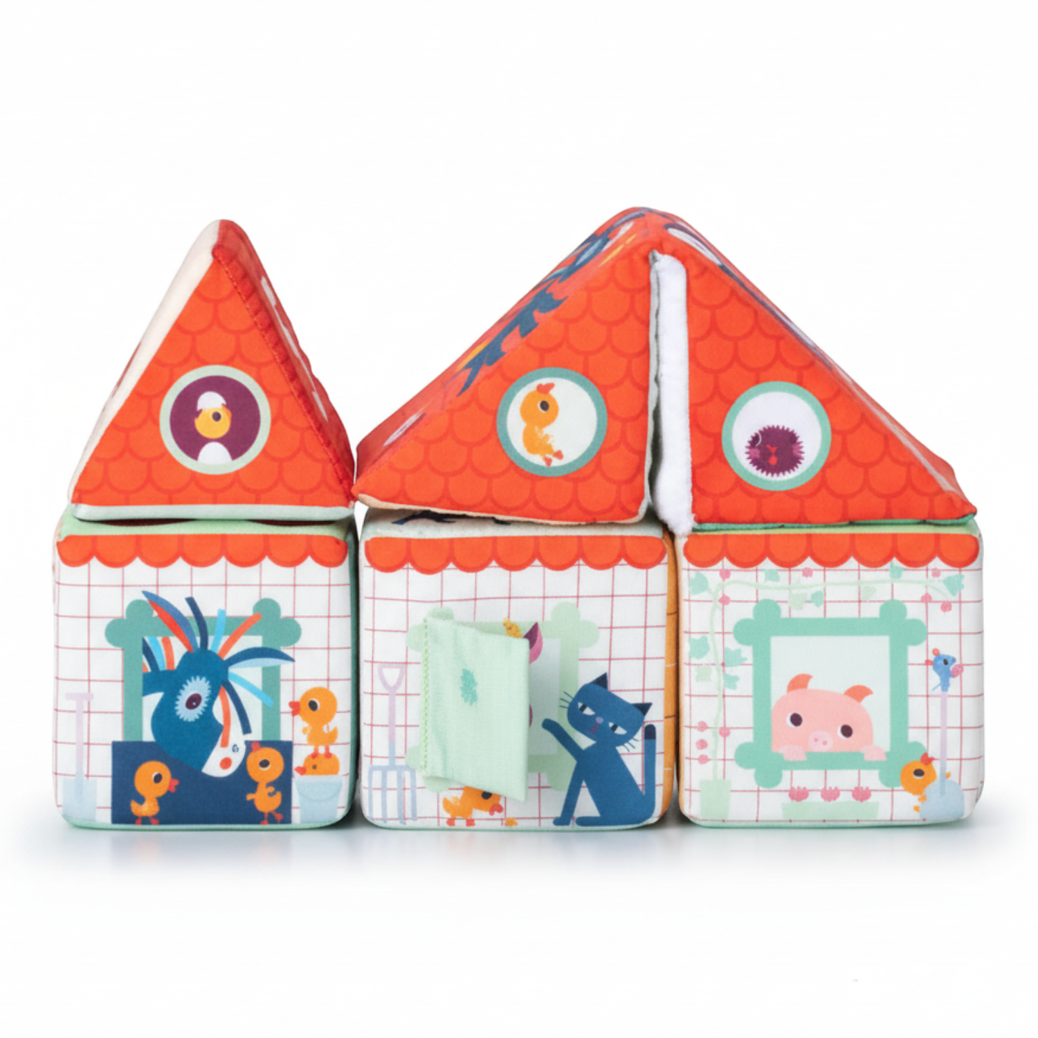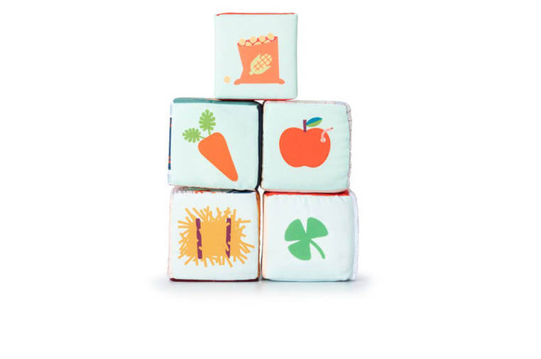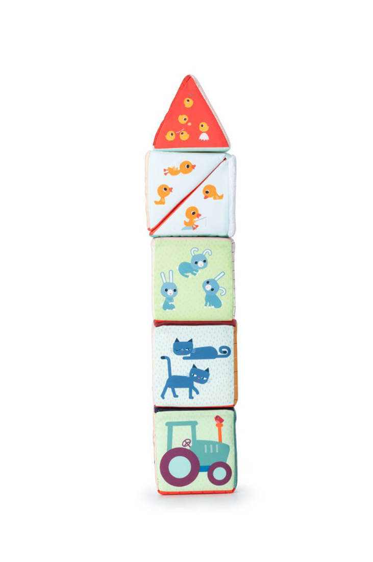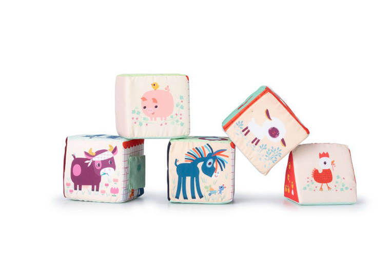 o niebanalna zabawka dla małych dzieci. Każdy z elementów ma inne ilustracje, a niektóre również ukryte elementy i funkcje. 4 mają kształt sześcianów, z których jeden można rozkładać na pół po przekątnej, ostatni zaś jest graniastosłupem o trójkątnych bokach. Można z nich ułożyć stodołę z czerwonym dachem, okienkami i otwieranymi drzwiami. Na kolejnych bokach znajdują się postacie gospodarskich zwierzątek: kokoszki Paulette, świnki Simona, krówki Rosalie, osiołka Ignace'a oraz owieczki Yvonne. Kolejne boki obszyte zostały tkaninami o różnych fakturach i służą do ćwiczeń sensorycznych, na następnych znajdują się cyfry od 1 do 5, a na jeszcze następnych – elementy w odpowiedniej liczbie, tj. 1 traktor, 2 koty, 3 zajączki, 4 kaczątka i 5 kurczaczków. Na ostatnich bokach znaleźć można ilustracje plonów: siano, marchew, koniczynę, jabłko i kukurydzę. Zestaw rozwija małą motorykę (chwytanie, ustawianie jeden na drugim, obracanie, otwieranie, zamykanie), aktywizuje zmysł wzroku (kolory) i dotyku (materiały o zróżnicowanej fakturze, wystające detale), stanowi świetne wprowadzenie do nauki liczenia i rozpoznawania cyfr (do 5), zaznajamia dziecko z życiem na farmie, zwierzętami i typowymi dla tego miejsca zjawiskami.