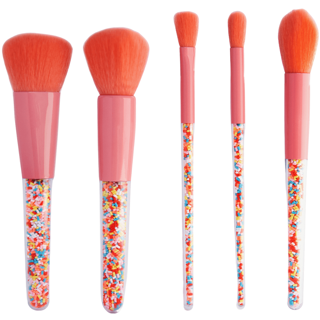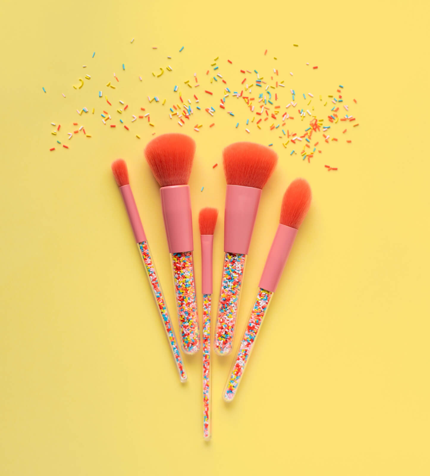 Zestaw zawiera pięć delikatnych pędzelków dla dzieci, które są hipoalergiczne, wegańskie i nigdy nie testowane na zwierzętach. Delikatnie zakończone włókna nie podrażniają wrażliwej skóry dzieci. Każdy pędzelek posiada efektowne uchwyty imitujące słodką posypkę – z pewnością wywołają uśmiech na twarzy Twojego malucha podczas zabawy! Pędzle zapakowane są w przezroczystą zapinaną kosmetyczkę.