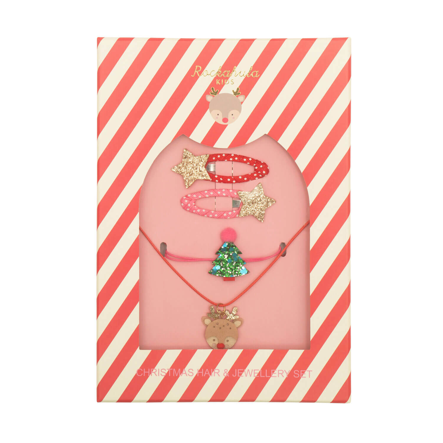 Zestaw zawiera dwie złote spinki w kształcie gwiazdek pokryte brokatem, naszyjnik z reniferem oraz bransoletkę z choinką.