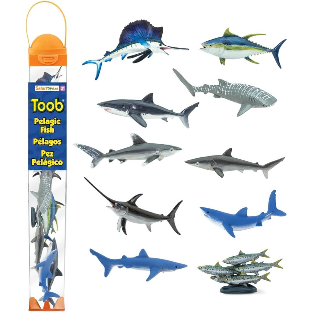 Zestaw 10 figurek ryb żyjących w strefie pelagicznej, w tym sześć różnych rekinów, zapakowanych w praktyczną tubę. Figurki amerykańskiej marki Safari są ręcznie malowane i profesjonalnie wykonane, ukazując realistyczne detale i unikalne cechy różnych ryb żyjących w oceanach w tym fascynujące różnice między rekinami.