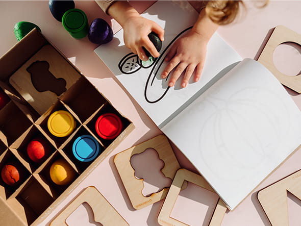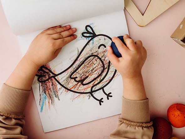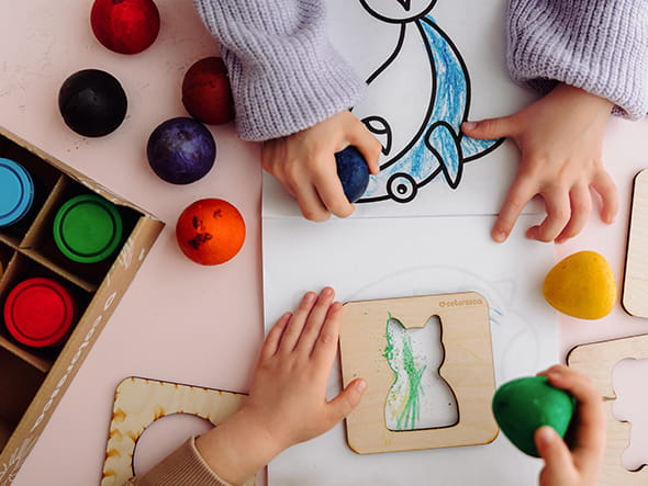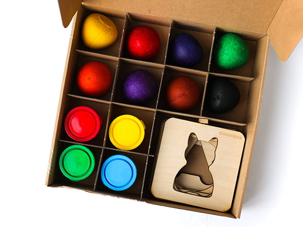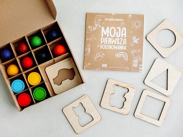 - zestaw składa się z kredek, farbek, kolorowanek i szablonów.