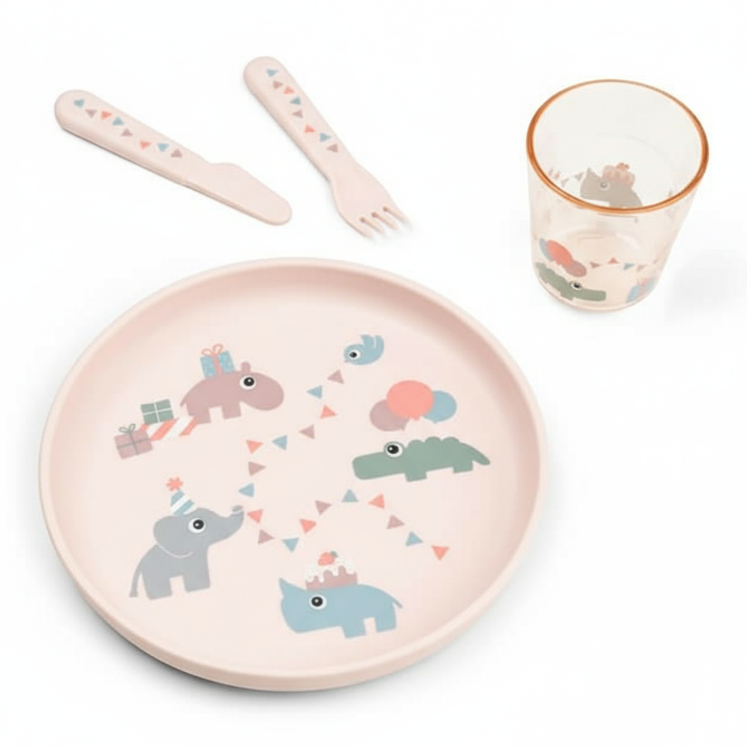 - kompletny zestaw na pyszny obiadek: talerzyk, sztućce, kubek i książeczka dla umilenia oczekiwania na posiłek,