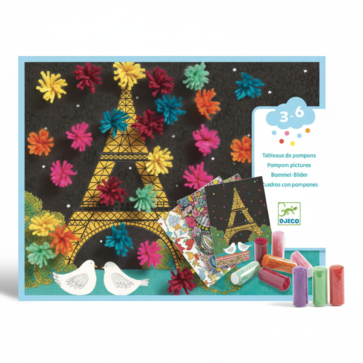 - 168 kolorowych wałeczków w których znajdują się pompony (samoprzylepne),
