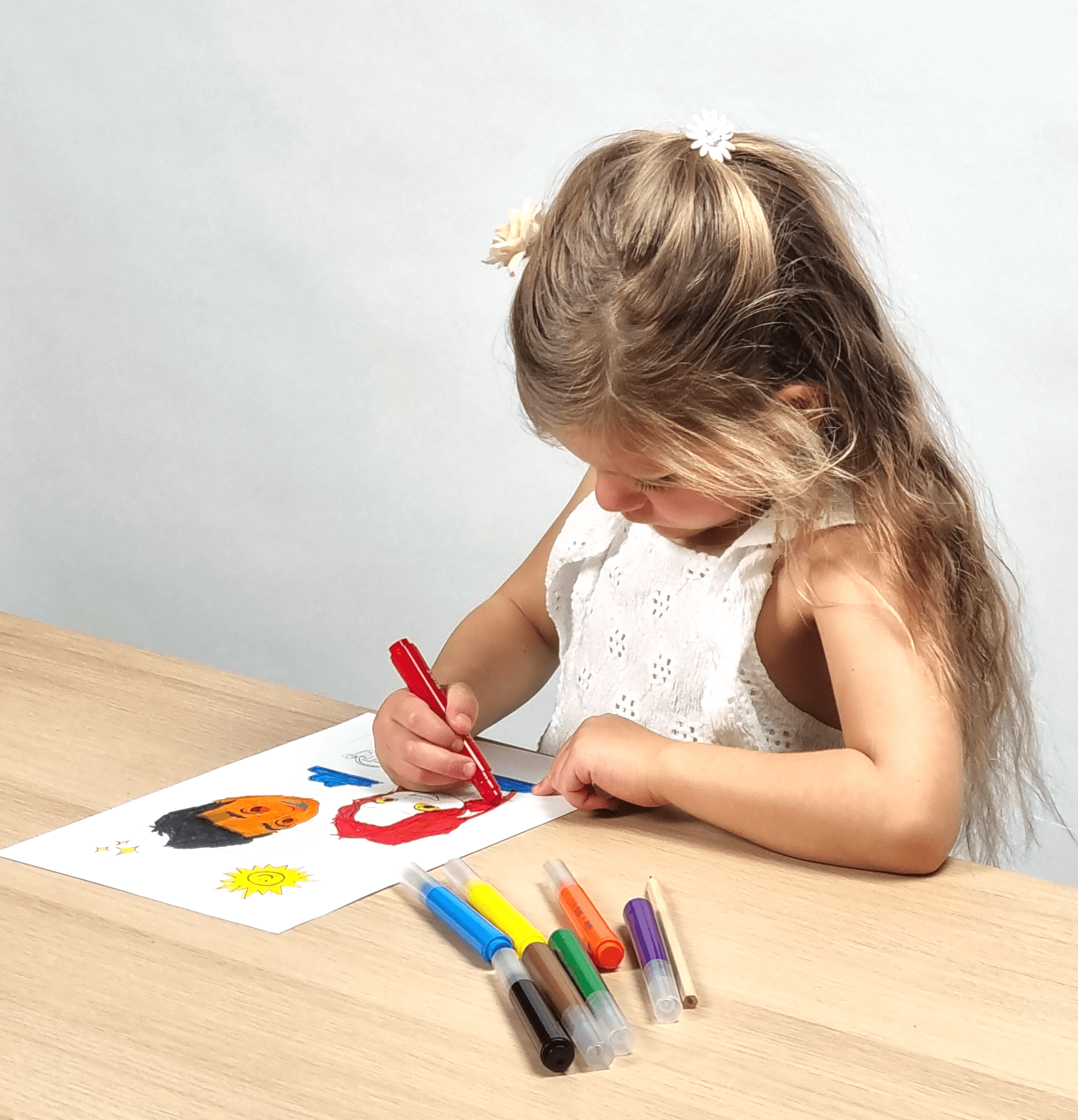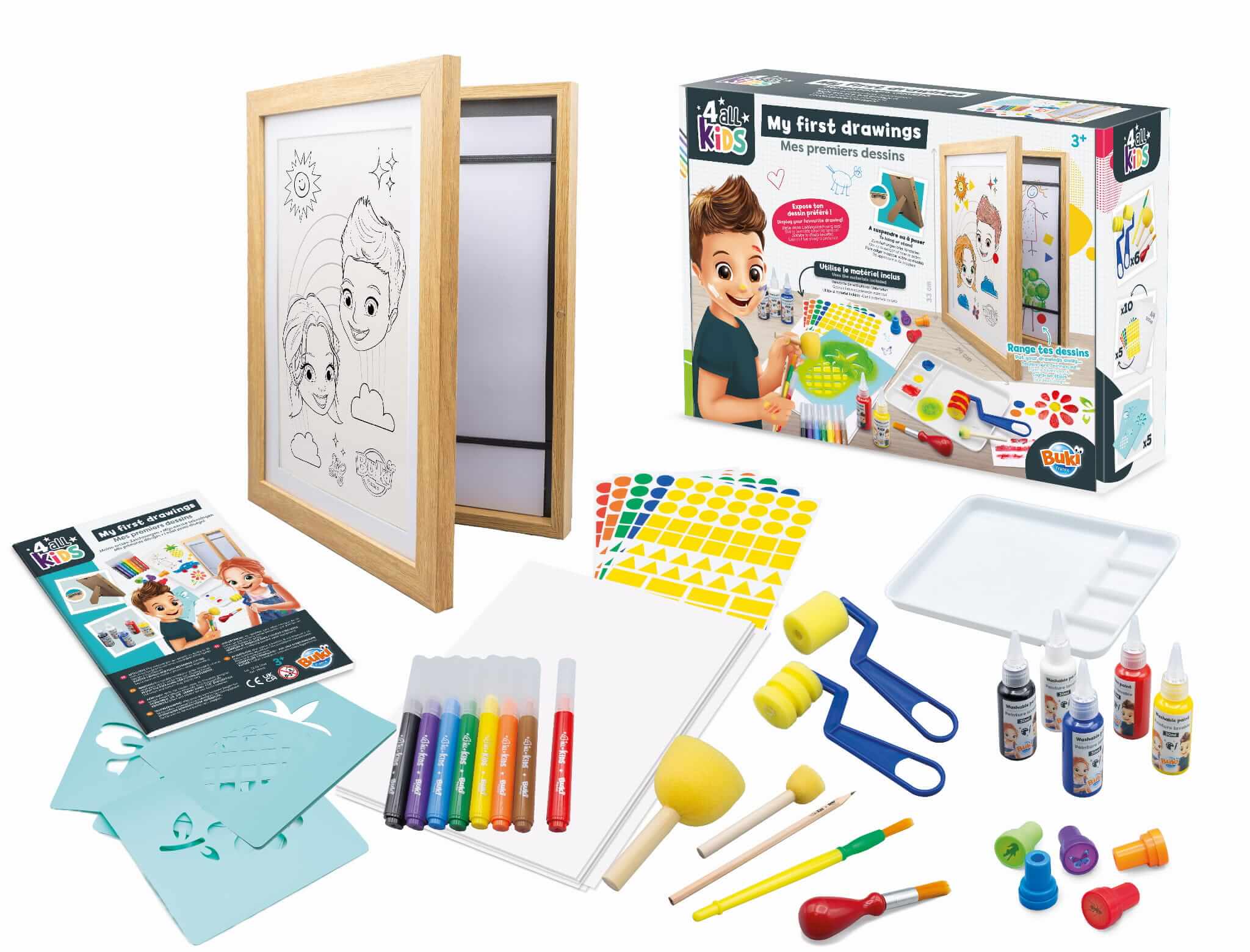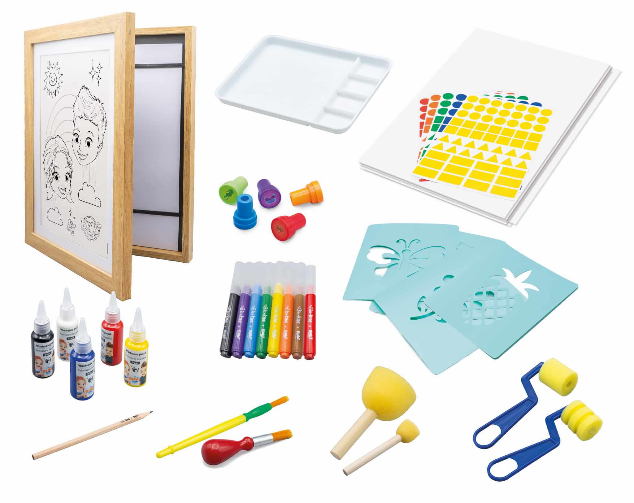 Malowanie przy pomocy gąbek, stemplowanie, a może malowanie pędzelkiem czy odrysowywanie szablonów? Zestaw posiada ramkę do przechowywania i eksponowania prac dzieci. Dzieci nie zgubią już więcej swoich rysunków: ramka posiada specjalny schowek, z gumkami przytrzymującymi arkusze papieru, który pomieści i przechowa do 50 rysunków. Ramkę można powiesić lub postawić na meblu. Dzięki dostarczonym materiałom dzieci mogą rysować, malować i przyklejać naklejki, aby rozwijać swoją kreatywność i umiejętności motoryczne.