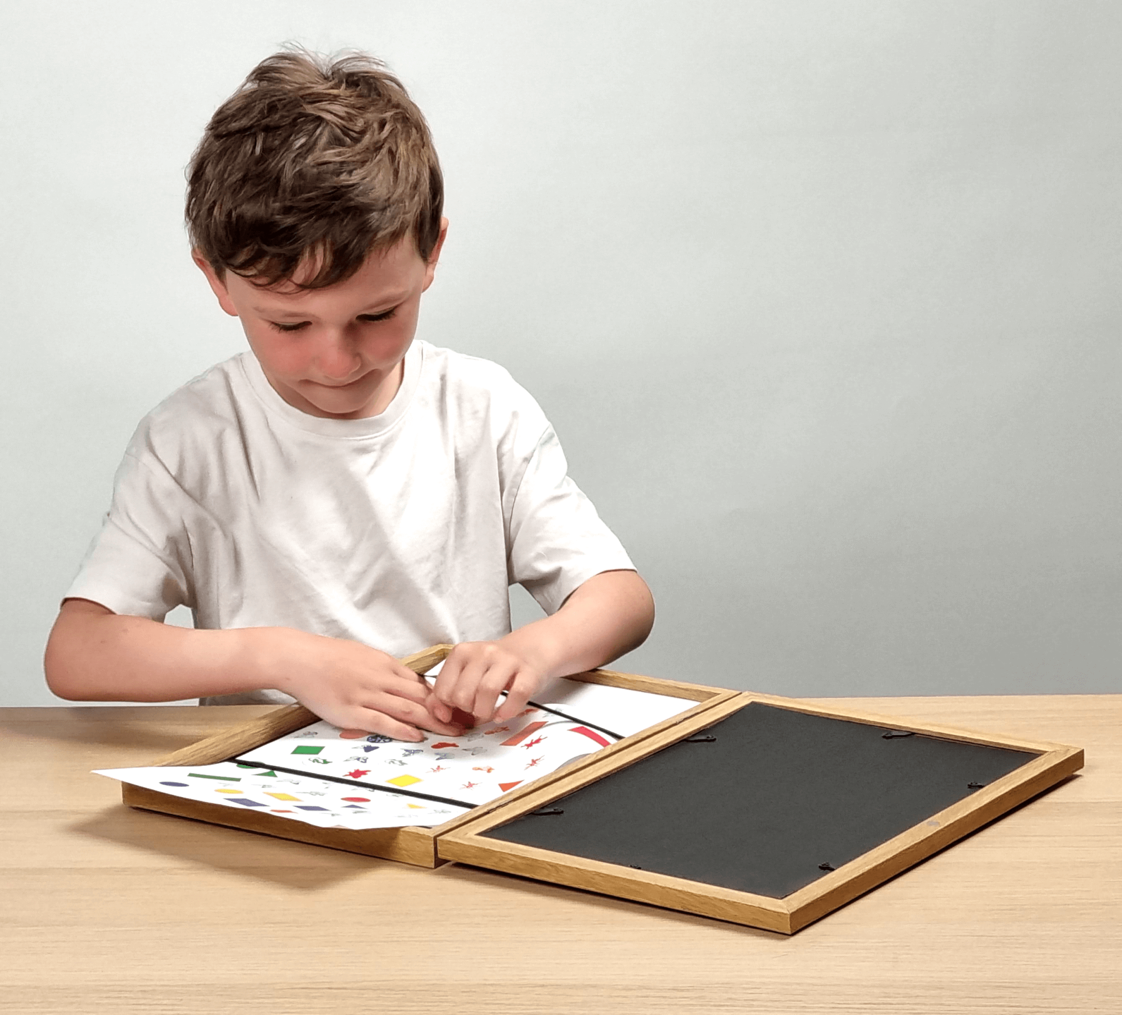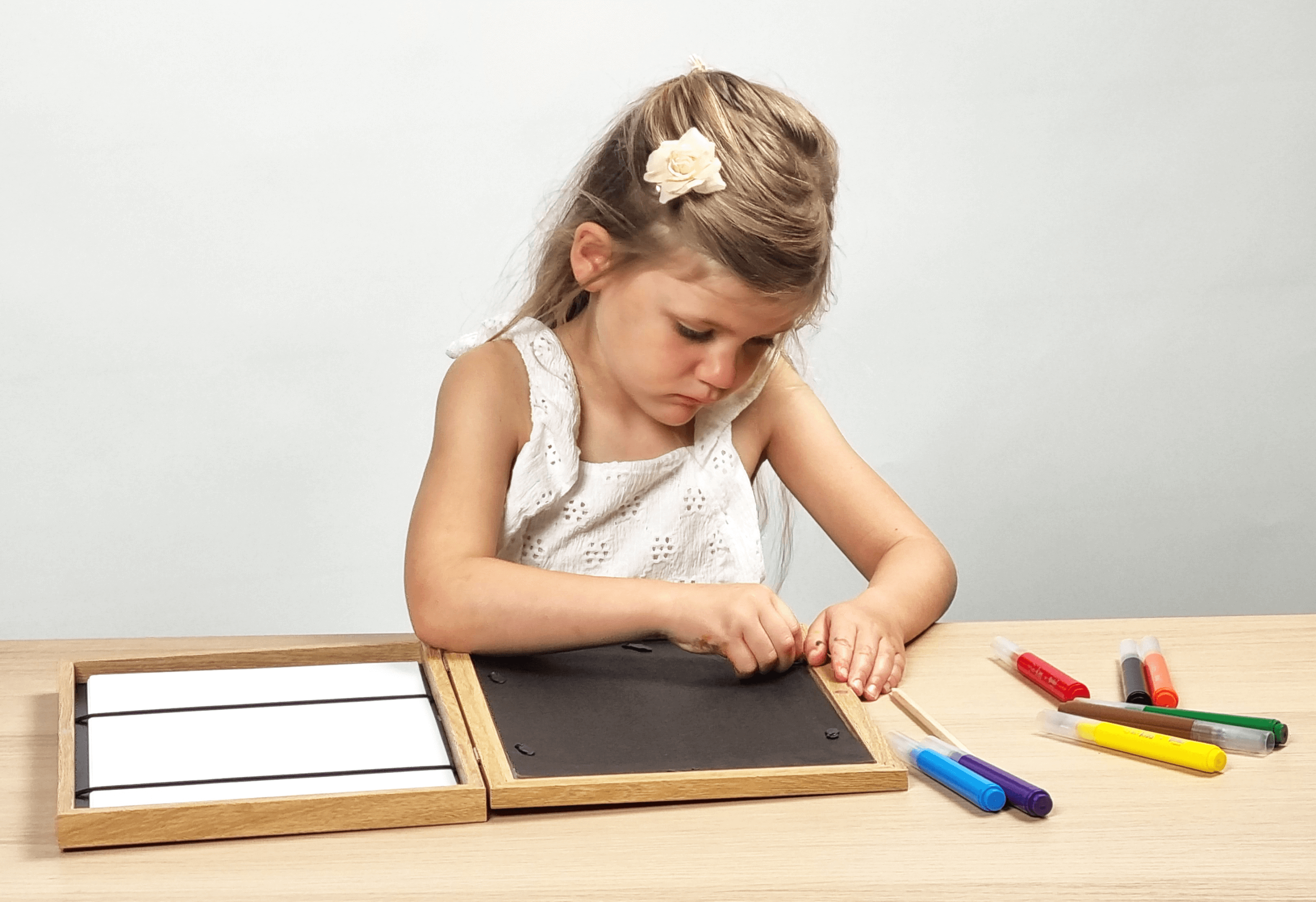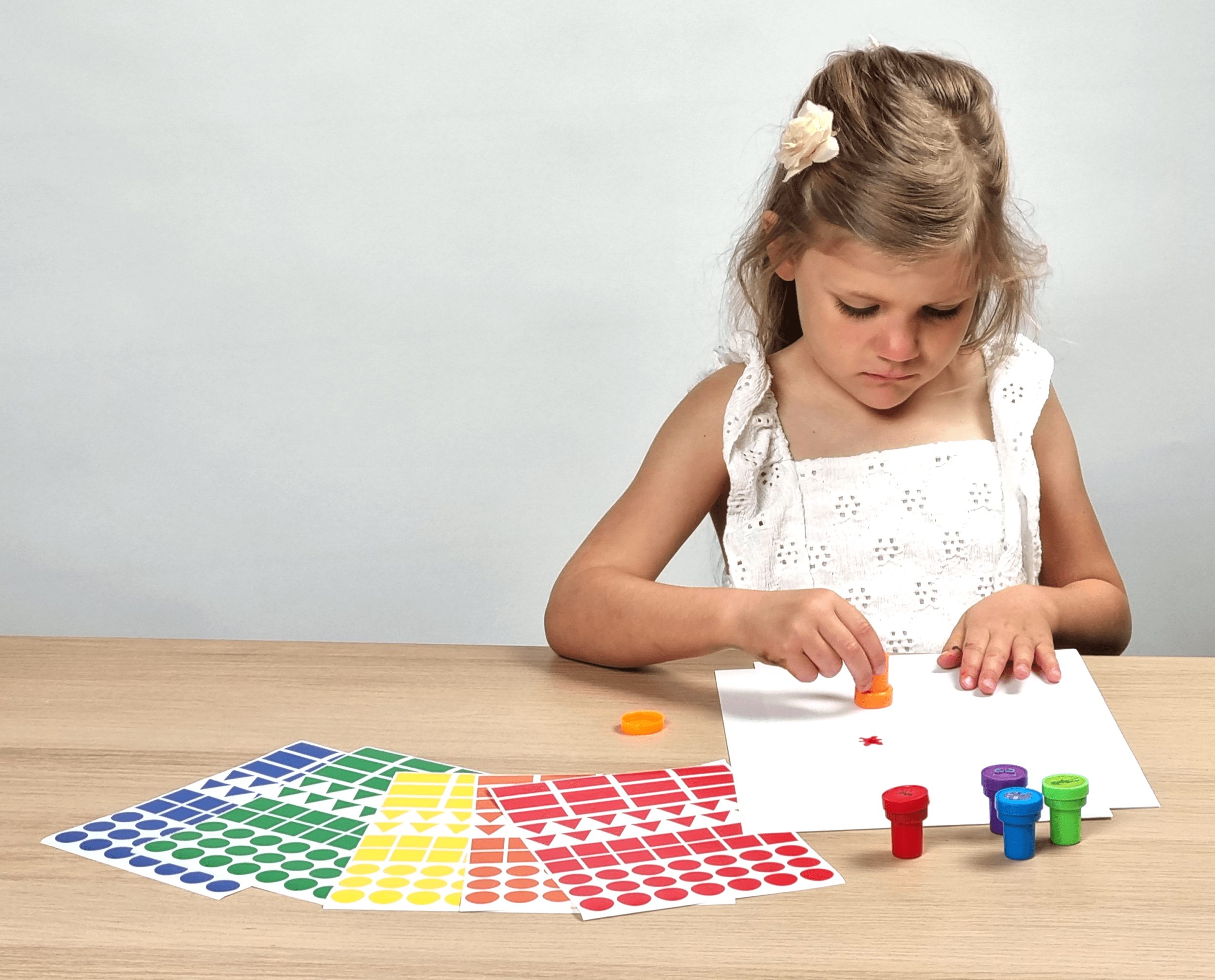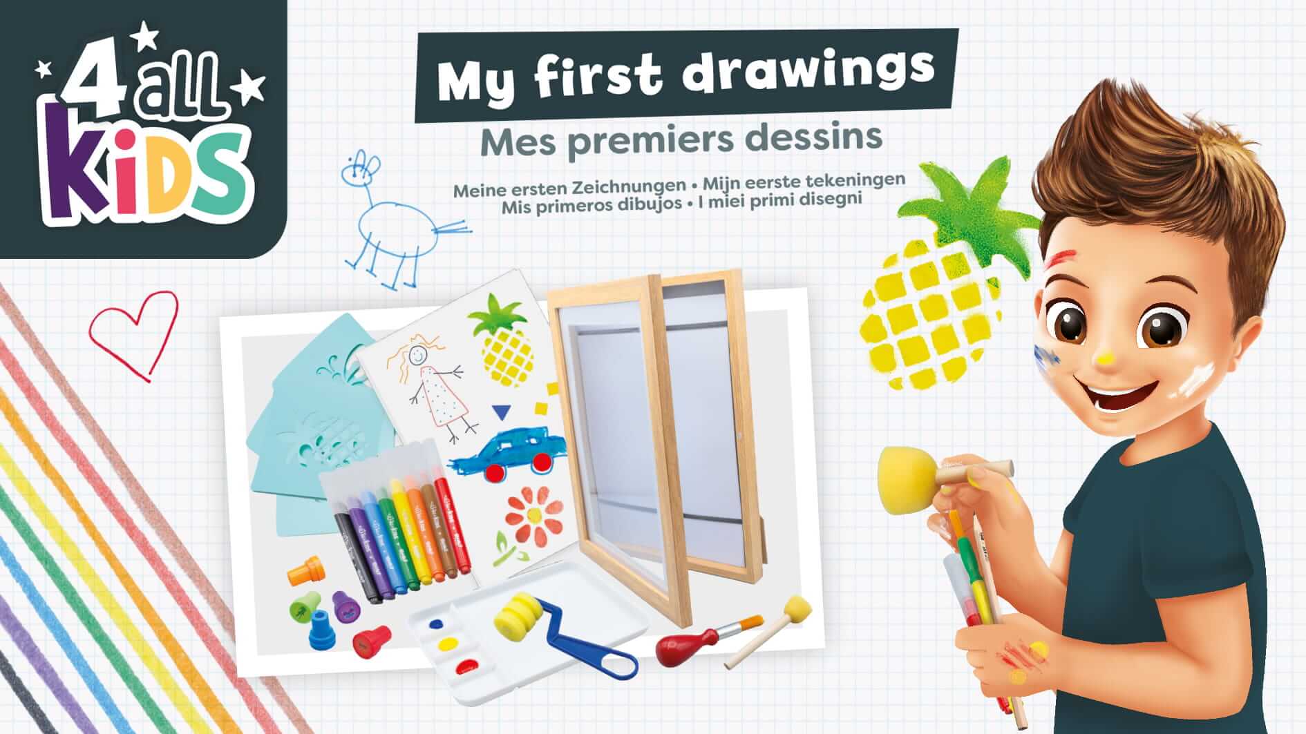 Malowanie przy pomocy gąbek, stemplowanie, a może malowanie pędzelkiem czy odrysowywanie szablonów? Zestaw posiada ramkę do przechowywania i eksponowania prac dzieci. Dzieci nie zgubią już więcej swoich rysunków: ramka posiada specjalny schowek, z gumkami przytrzymującymi arkusze papieru, który pomieści i przechowa do 50 rysunków. Ramkę można powiesić lub postawić na meblu. Dzięki dostarczonym materiałom dzieci mogą rysować, malować i przyklejać naklejki, aby rozwijać swoją kreatywność i umiejętności motoryczne.