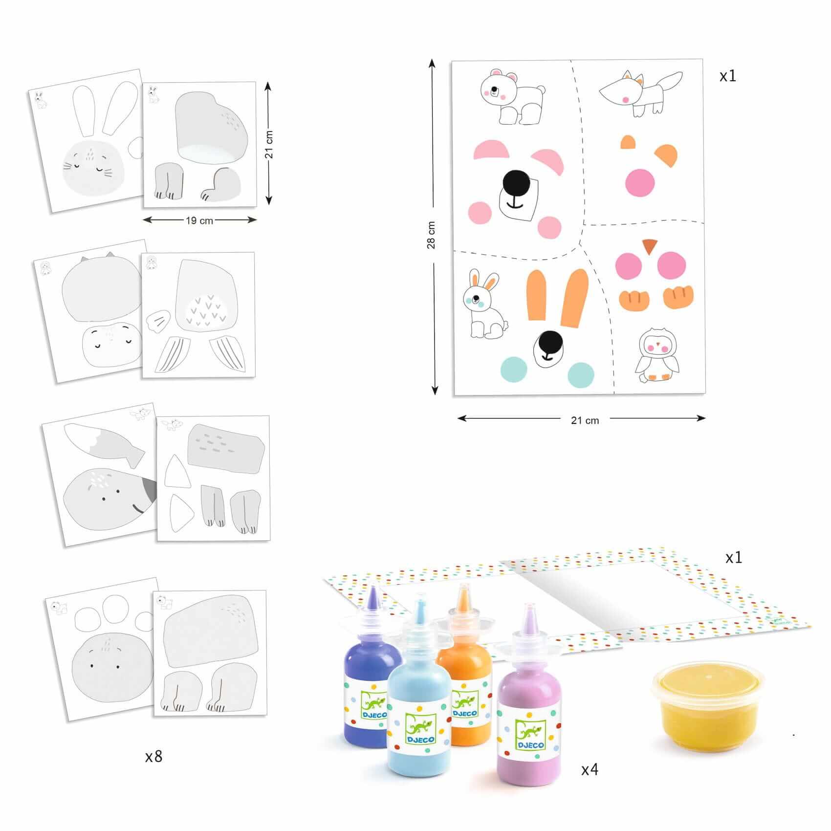 Aktywność malarska dla początkujących od 18 miesiąca życia. Z tym zestawem można stworzyć 4 urocze zwierzęta w 2D.