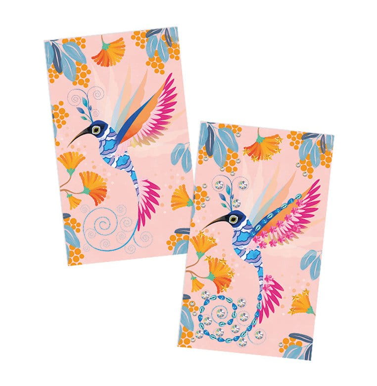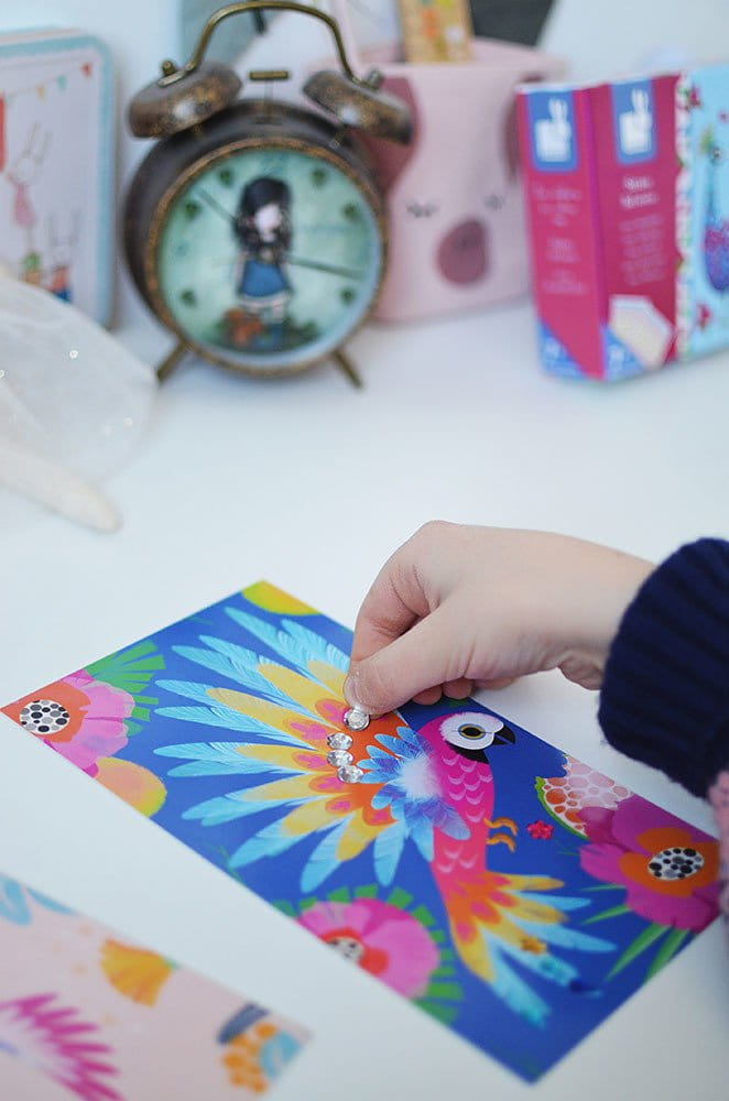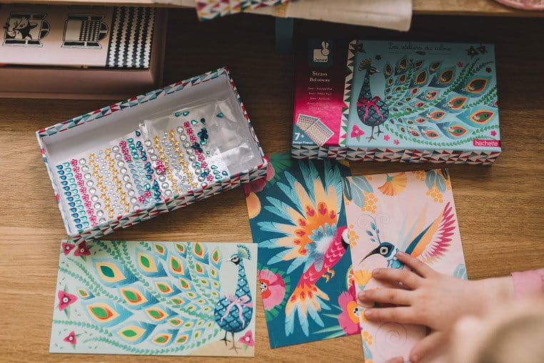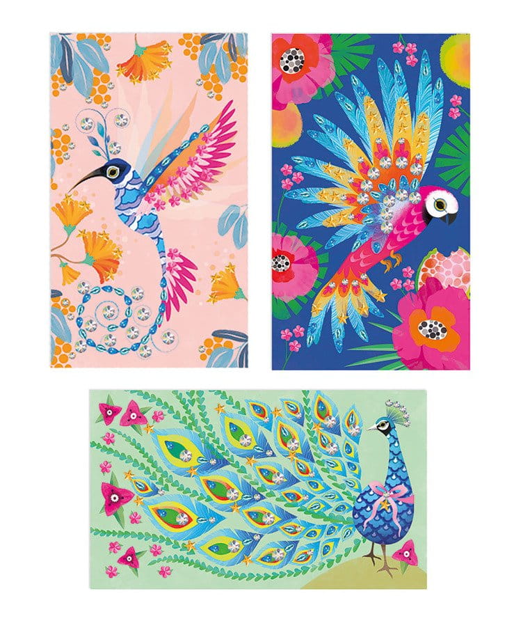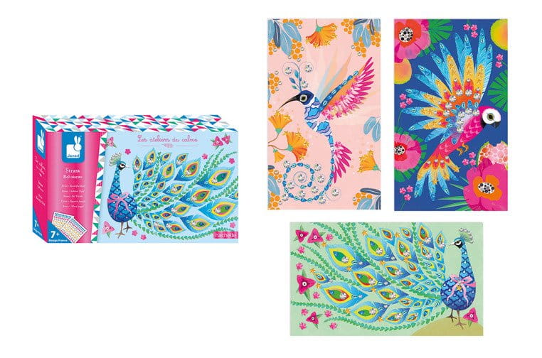 Zestaw kreatywny Czarodziejskie cyrkonie Piękne ptaki francuskiej marki JANOD zawiera 3 plansze-obrazki z zachwycająco barwnymi: pawiem, kolibrem i papugą. Do ilustracji tych można – zarówno w sugerowanych miejscach, jak i dowolnie – przyklejać dołączone do zestawu błyszczące cyrkonie (2 arkusze).