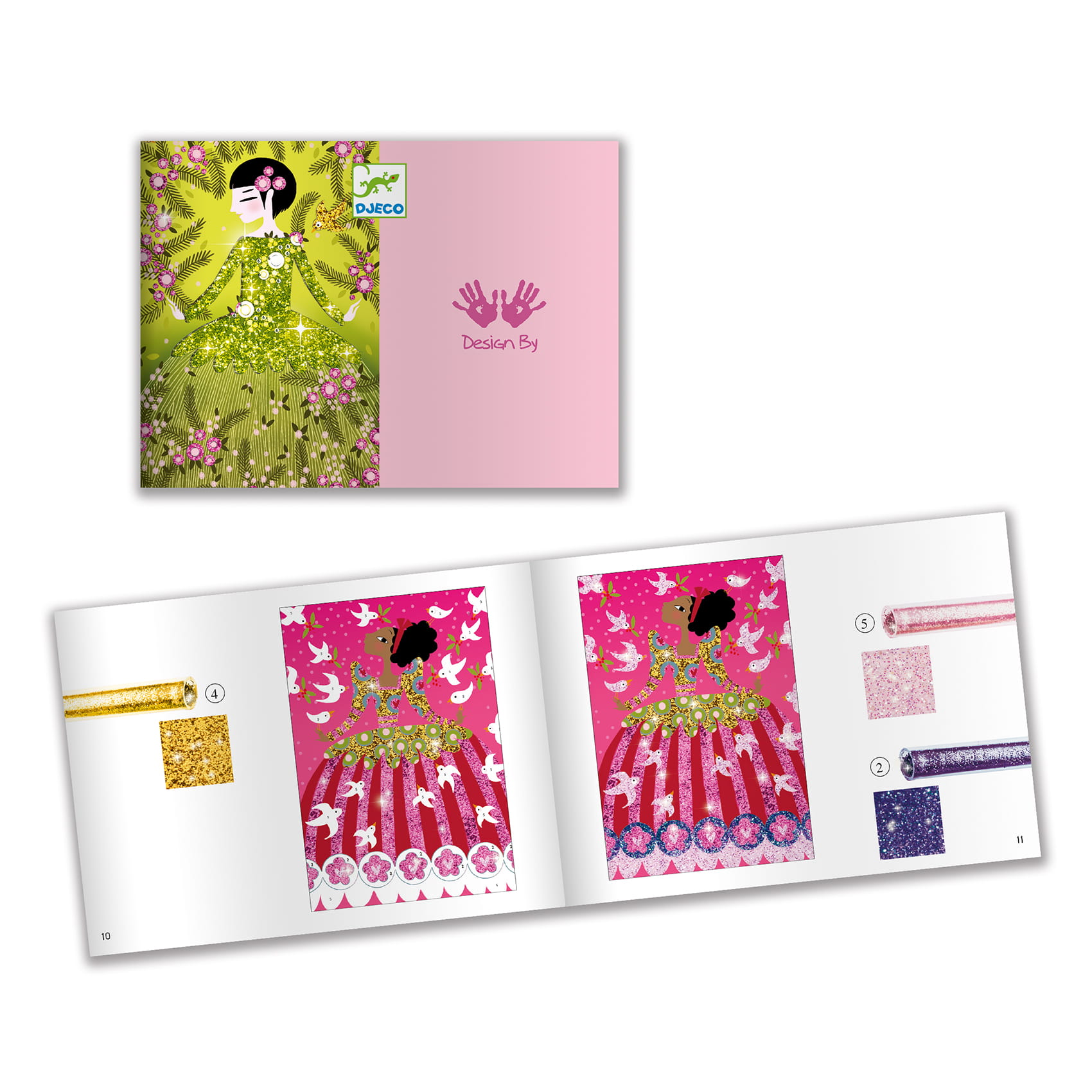 Zestaw artystyczny do ozdabiania brokatem. Każdy element jest ponumerowany i pokryty klejem zabezpieczonym naklejką. Dziecko odrywa fragment "naklejki" i posypuje kolorowym brokatem. Brokat przykleja się a jego nadmiar zsypujemy