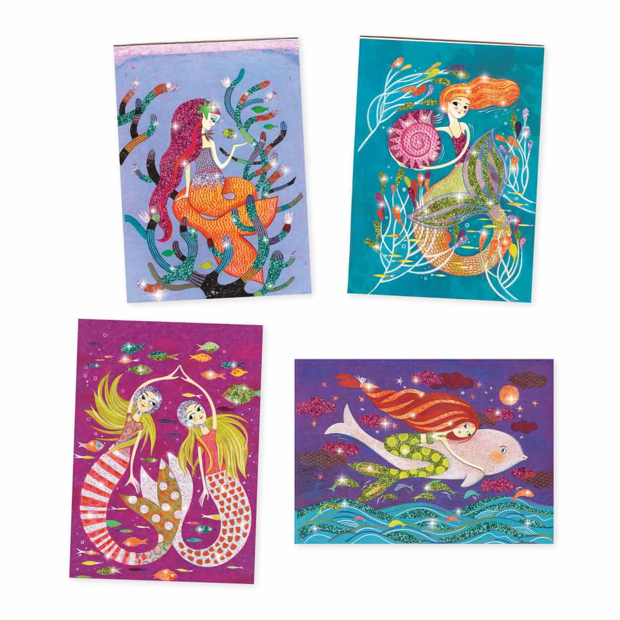 Zestaw artystyczny w którym dziecko dekoruje obrazki za pomocą kolorowych brokatów