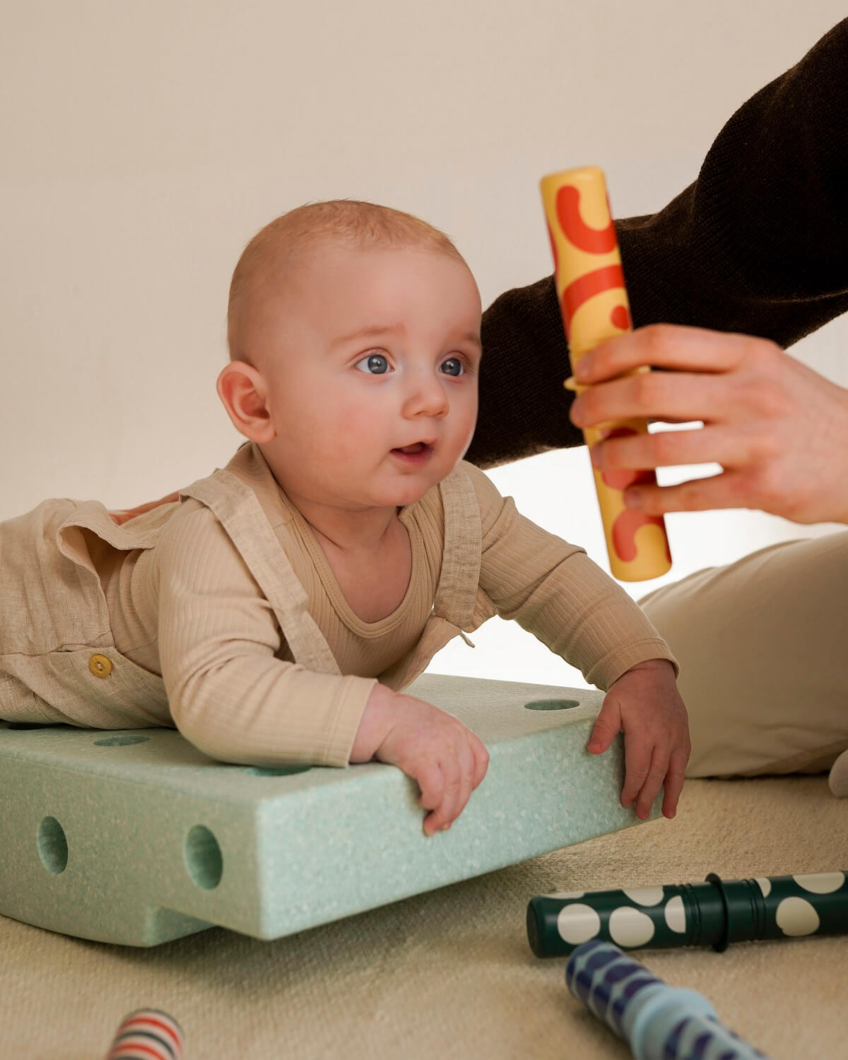 W zestawie poza sensorycznym blokiem piankowym, dzięki któremu maluszek może się położyć, chwiać, przechylać i kołysać znajdują się kolorowe grzechotki z ciekawymi wzorami i dźwiękami, zapewniającymi stymulację wizualną i sensoryczną — to idealny duet, który gwarantuje ciekawą, kreatywną i pobudzającą zmysły dziecka zabawę.