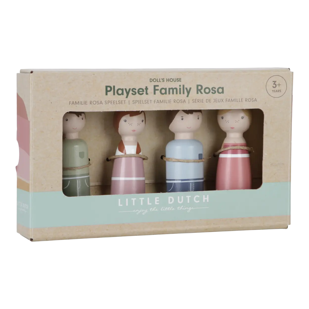 Poznaj rodzinę Rosy - to zestaw drewnianych laleczek, składający się z taty, mamy, syna i córki Rosy, która jest Wam doskonale znana! Ten zestaw jest doskonałym dodatkiem do nowego domku dla lalek Little Dutch. Gwarantuje wiele godzin fantastycznej zabawy. Laleczki wykonane są z drewna z certyfikatem FSC i pokryte farbami na bazie wody. Wszystkie zestawy do domku Little Dutch można łączyć ze sobą - skomponuj swój wymarzony domek dla lalek razem z Little Dutch.