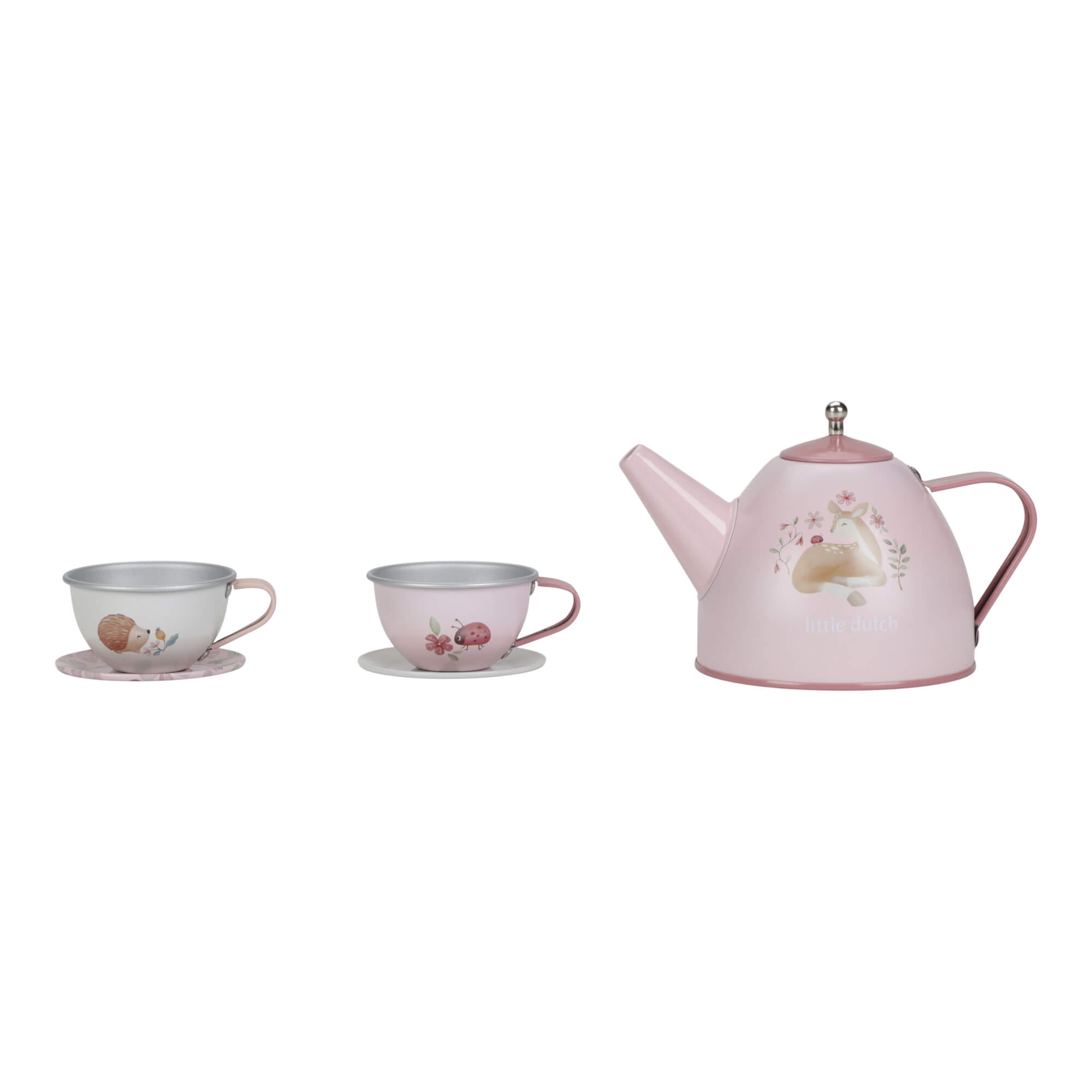Zestaw zawiera dwie filiżanki, dwa spodki, tacę i czajniczek z pokrywką – całość można włożyć do walizeczki i zabrać ze sobą. Doskonały do zabawy w odgrywanie ról, rozwija wyobraźnię i stymuluję rozwój motoryczny dziecka. Świetny pomysł na prezent i doskonałe uzupełnienie dla pozostałych zabawek z kolekcji Fairy Garden od Little Dutch.