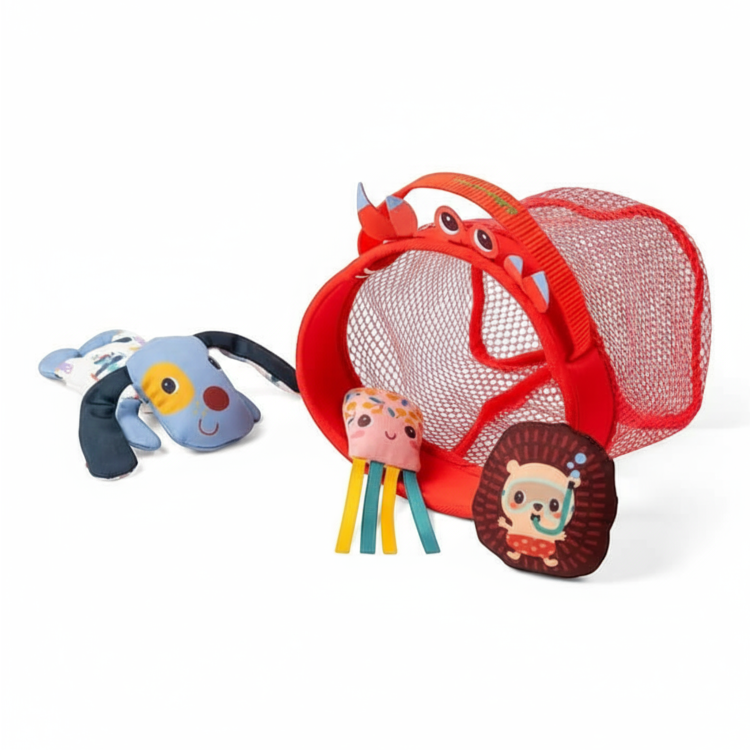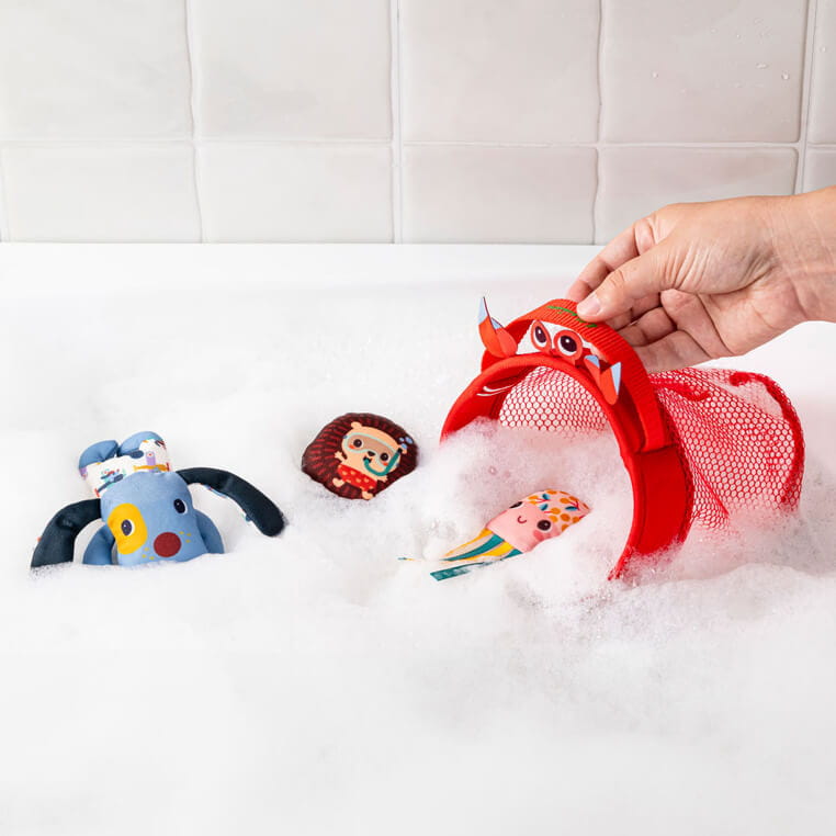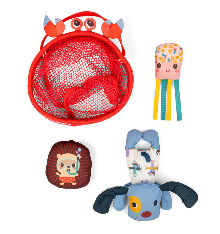 Wykonane są z miękkiego, łatwego do czyszczenia i szybkoschnącego materiału. Czerwona przestronna sieć ma krabie oczy i szczypce oraz wygodny uchwyt. Można do niej łapać i przechowywać w niej dołączone do zestawu stworzenia: meduzę z tasiemkami sensorycznymi, nurkującego Jeża Leona oraz pływającego Pieska Julesa. Wszystkie one unoszą się na wodzie. Zabawka jest perfekcyjnie wykończona, z dbałością o każdy szczegół i w pełni bezpieczna dla dziecka. Umila czas spędzony w kąpieli, a przy okazji stymuluje sensorycznie (wystające elementy, uchwyty), rozwija sprawność motoryczną (chwyt, wkładanie i wyjmowanie, łowienie), logiczne myślenie (dostrzeganie związków przyczynowo-skutkowych) oraz wyobraźnię (snucie opowieści).