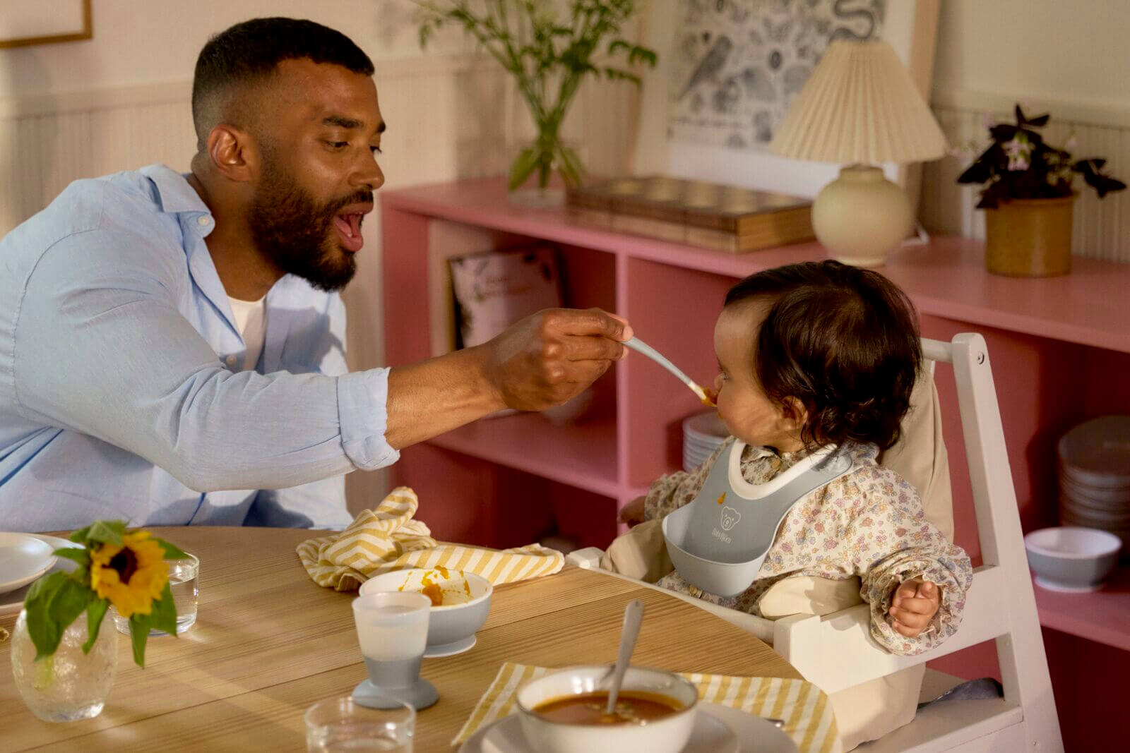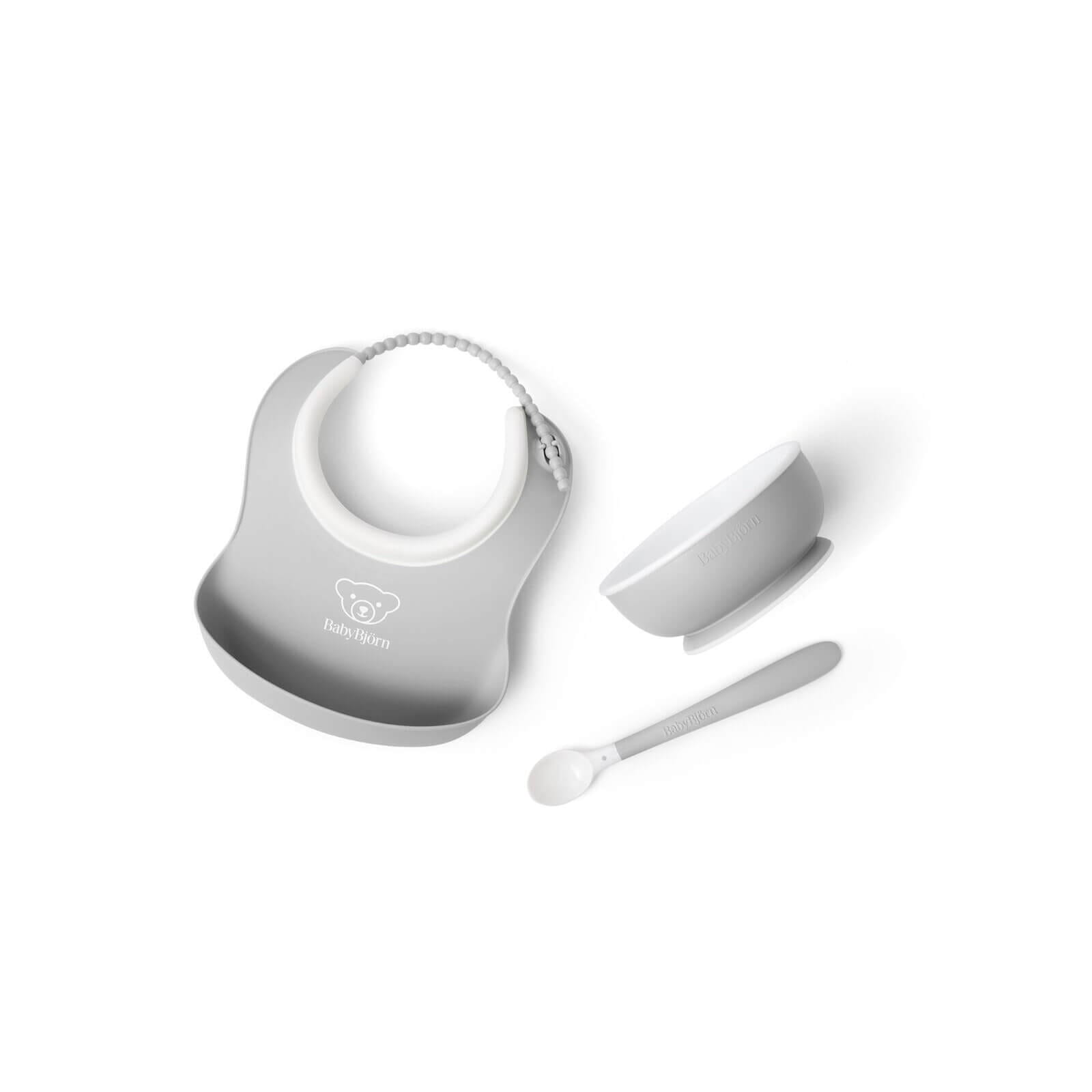 Niezbędny zestaw przy rozszerzaniu diety malucha oraz starszaków uczyć się jedzenia pokarmów stałych: mały śliniaczek z miękkim dekoltem i pojemną kieszonką, łyżeczka do karmienia z długą rączką i praktyczna miseczka dla dziecka.