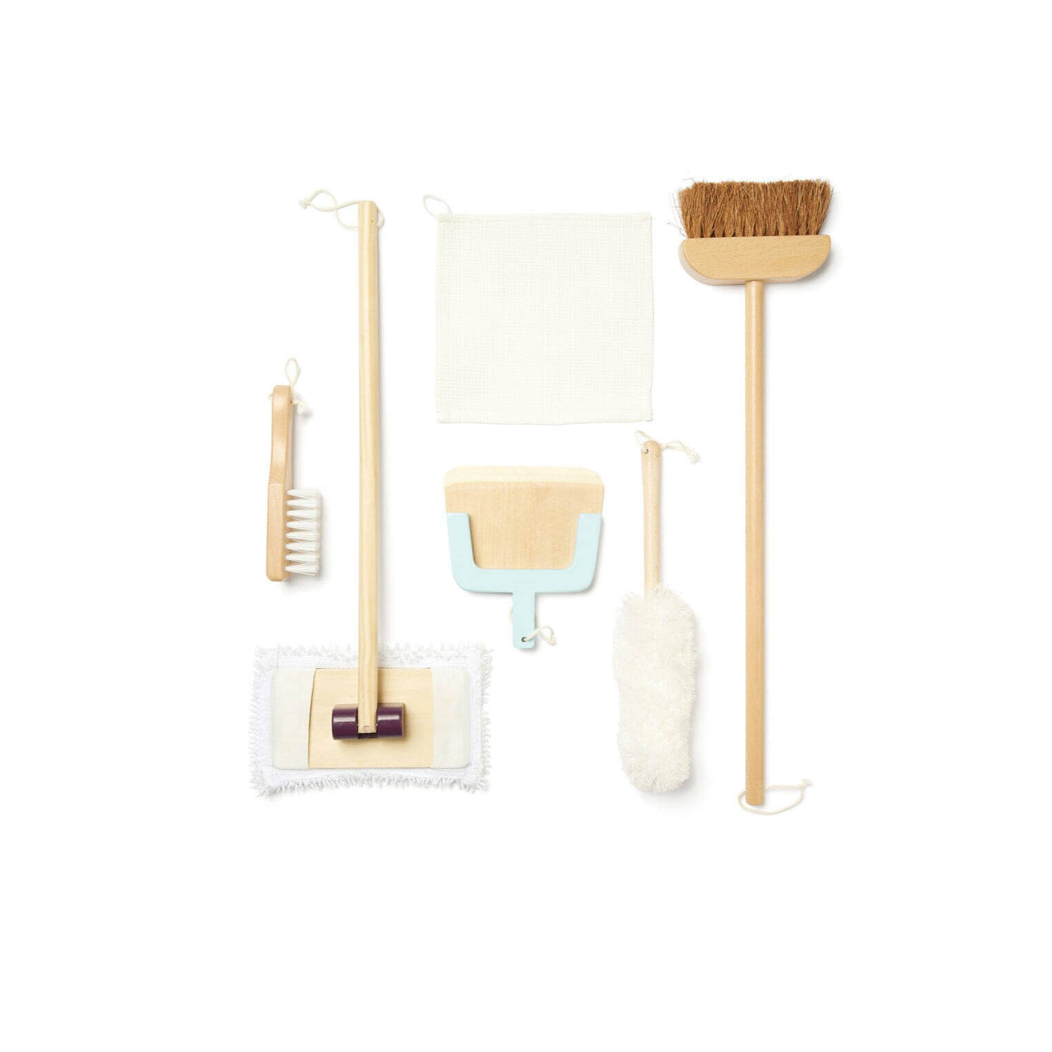 - Drewniany mop ze zdejmowaną szmatką - ułatwia "mycie" podłóg, a możliwość zdjęcia szmatki dodaje realizmu i uczy dbania o czystość narzędzi.