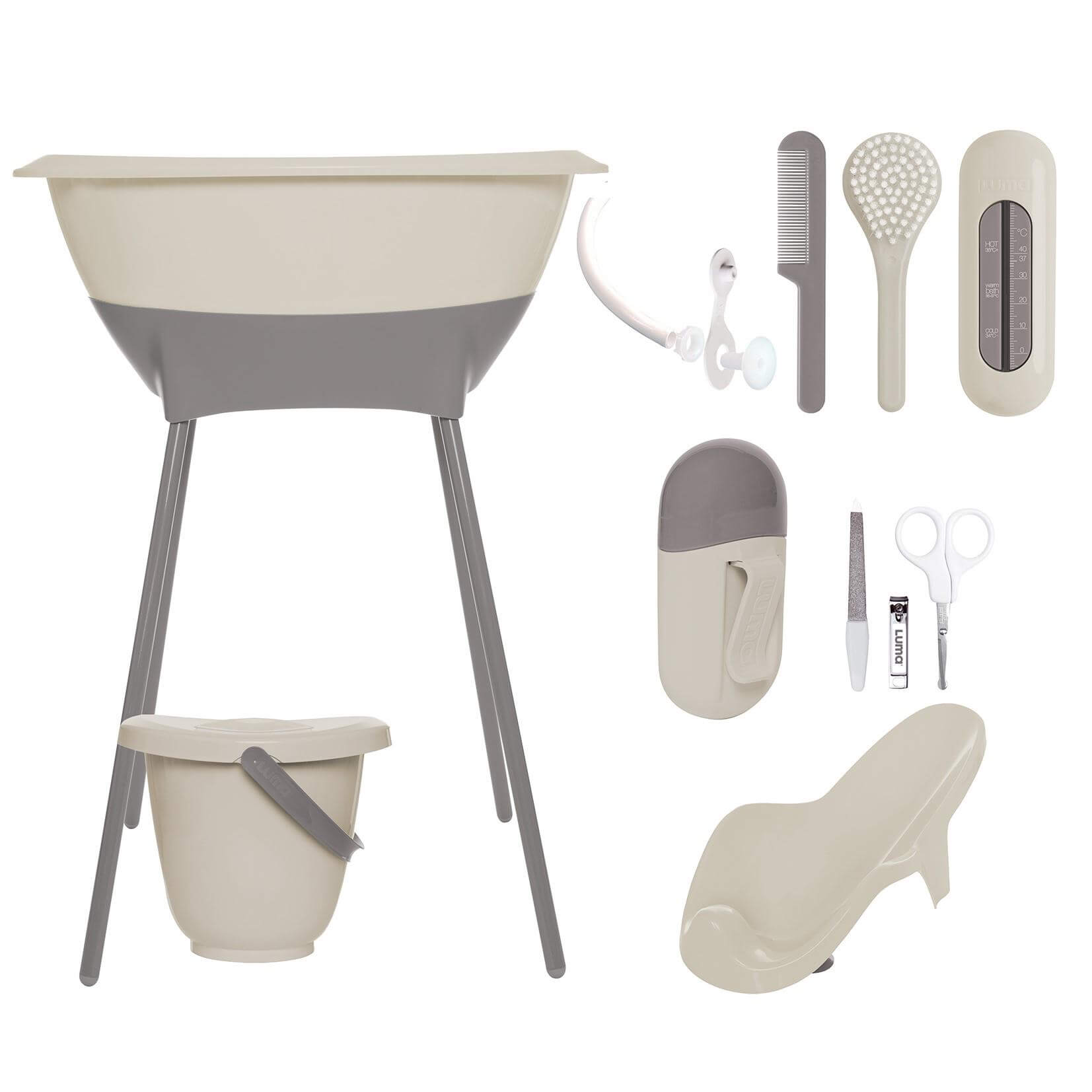 Wszystkie produkty Luma zostały zaprojektowane i wyprodukowane z najwyższą starannością w Holandii. Zestaw składa się z wanienki z rurką odpływową, stojaka, wiaderka na pieluszki, wkładki do wanienki, termometru do wody, zestawu do manicure oraz szczoteczki i grzebyka, które są niezbędne do pielęgnacji niemowląt.