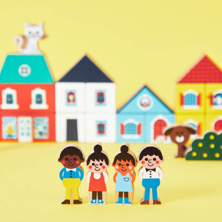 Zestaw klocków i figurek z serii Cross Roads francuskiej marki JANOD to doskonałe uzupełnienie maty-dywanu do zabawy z drogą Miasto z tej samej kolekcji