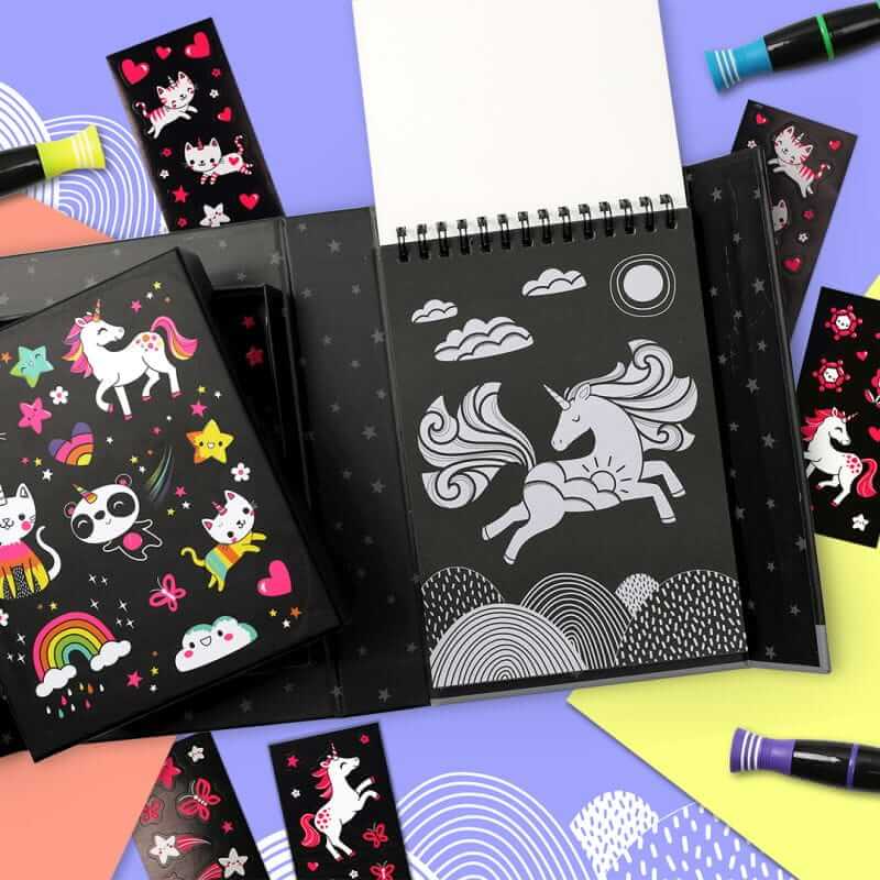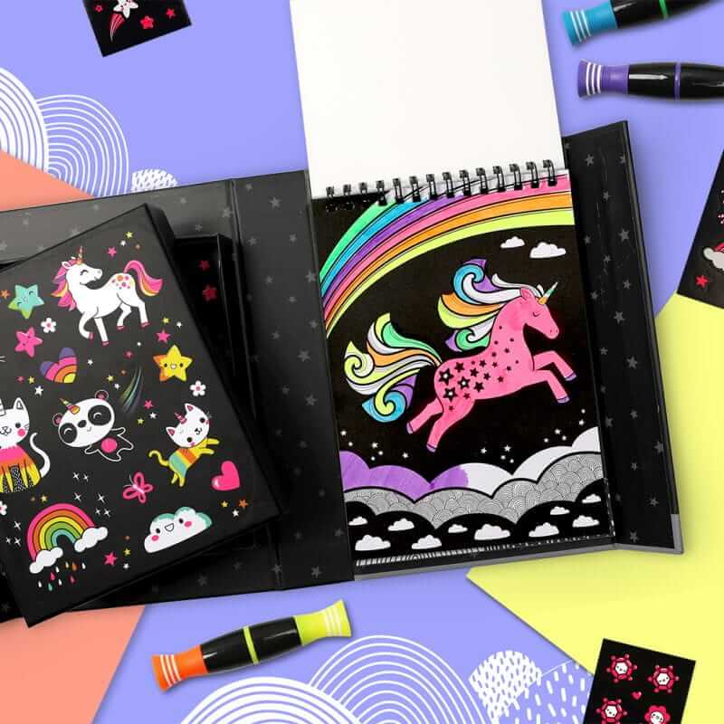 Zestaw Kolorowanek Neonowych - Jednorożce od Tiger Tribe to kreatywny zestaw wypełniony po brzegi aktywnościami, neonowymi markerami i naklejkami