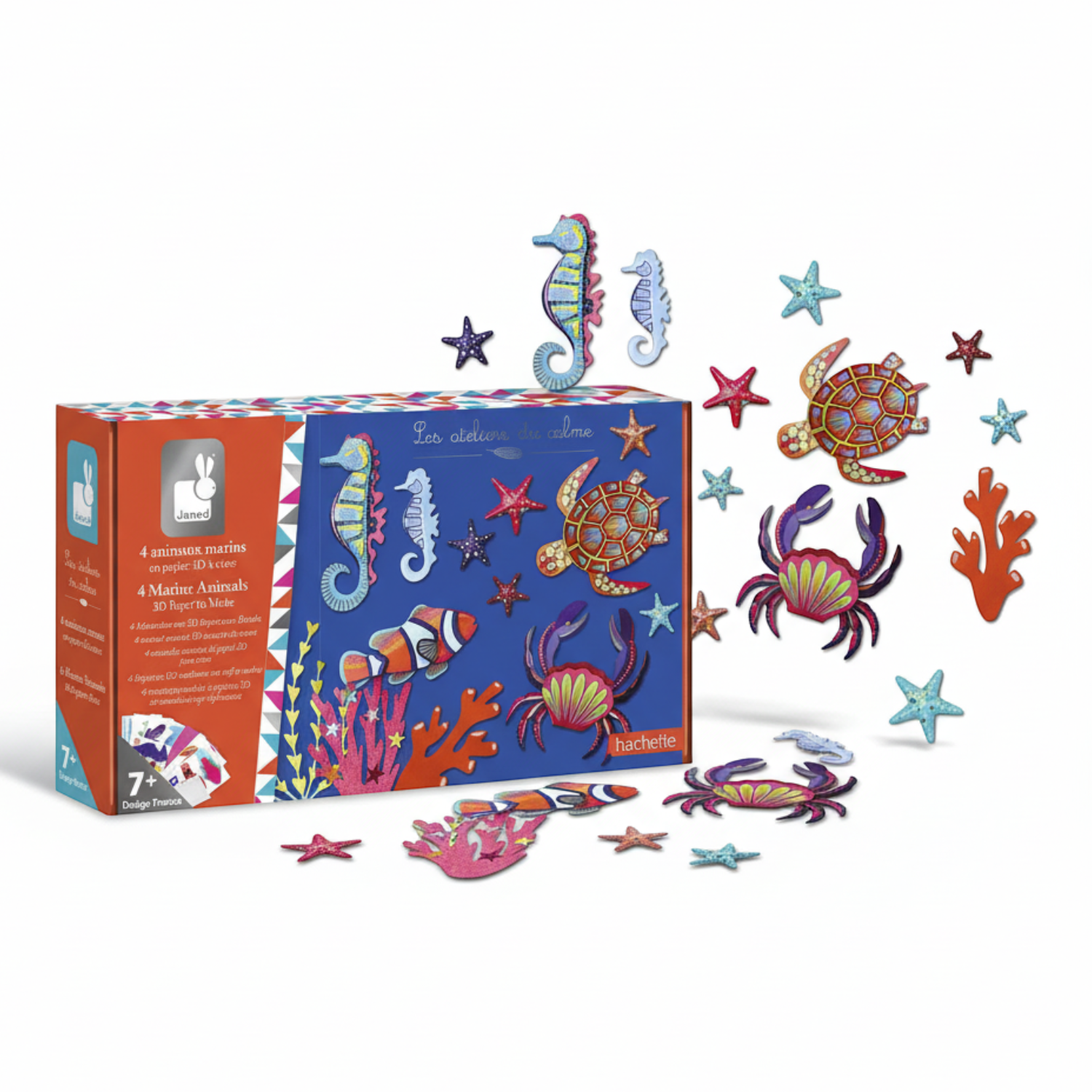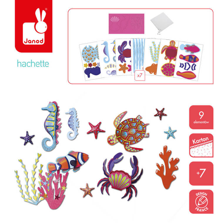 Zestaw kreatywny 4 zwierzęta morskie z papieru 3D francuskiej marki JANOD pozwoli stworzyć łącznie 4 rodzaje morskich żyjątek (koniki morskie, kraba, żółwia i rybkę) i inne elementy ich podwodnego świata (rozgwiazdy, koralowce, wodorosty). W jego skład wchodzi 7 arkuszy z wstępnie wyciętymi częściami, z których należy złożyć zwierzęta i roślinność, w tym 2 z połyskiem i 1 neonowy, 1 arkusz z naklejkami i 1 z dwustronnymi piankami samoprzylepnymi do łączenia pozostałych elementów w przestrzenne konstrukcje. Do zestawu dołączona jest szczegółowa instrukcja.
