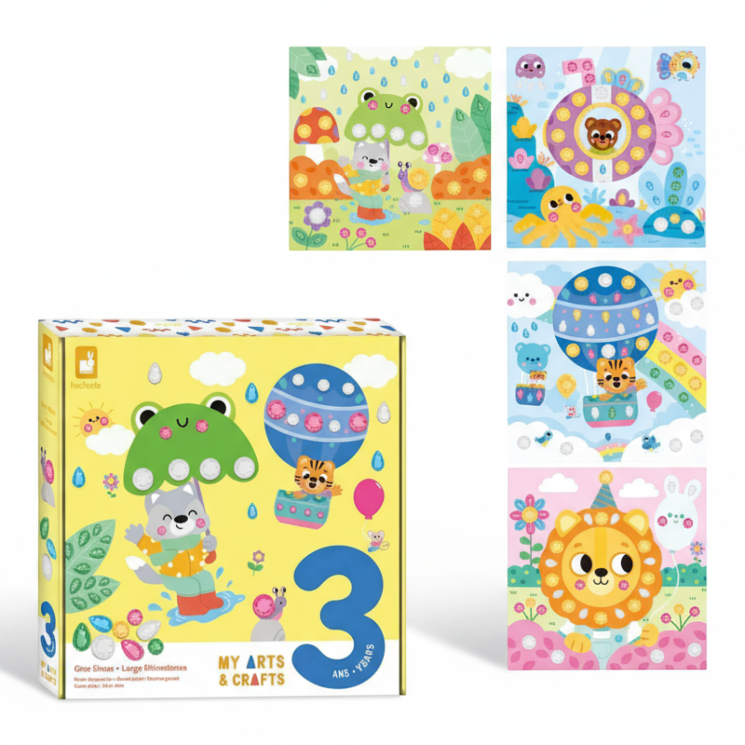 Zawiera 4 kwadratowe plansze z obrazkami, które przedstawiają: spacer w deszczu, lot balonem, podróż w łodzi podwodnej oraz lwa podczas przyjęcia urodzinowego w dżungli. Do ilustracji tych można – zarówno w sugerowanych miejscach, jak i dowolnie – przyklejać dołączone do zestawu kolorowe kryształki w różnych kształtach. Naklejanie i zdobienie to dla dziecka długie godziny angażującej i jednocześnie uspokajającej, wyciszającej zabawy.