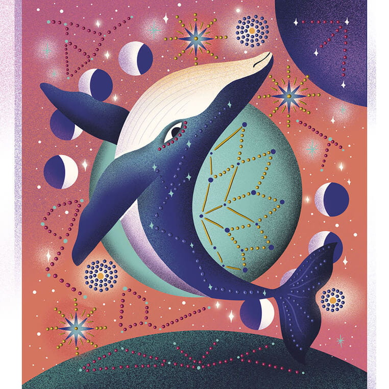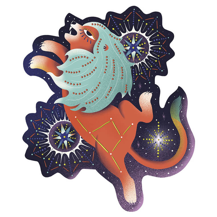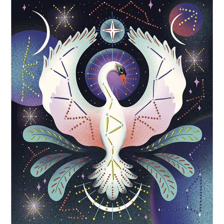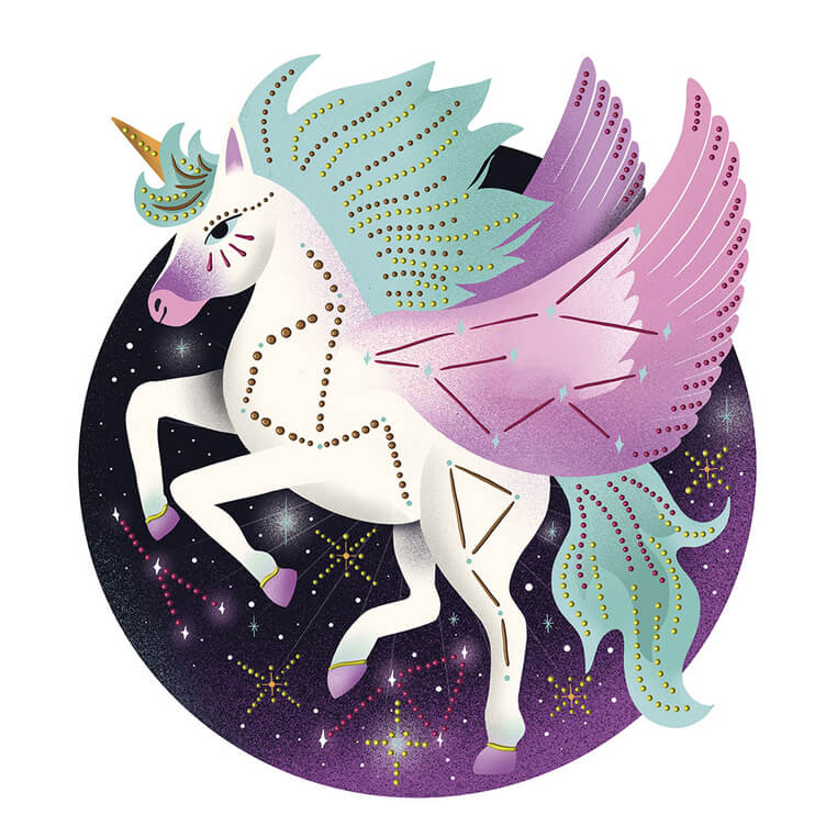 Zawiera łącznie 8 projektów do wykonania – 4 szersze i 2 węższe obrazki z postaciami zwierząt (m.in. niedźwiedzia czy łabędzia) na kosmicznym tle oraz 2 obrazki w nieszablonowych kształtach – z lwem i jednorożcem. Na ilustracjach zaznaczone są miejsca do ozdabiania. W komplecie znajduje się 5 tubek z farbami w róznych kolorach: różowym, pomarańczowym, żółtym, niebieskim i złotym. Tubki mają specjalne końcówki do robienia kropek i uzyskania efektu 3D. Malowanie tą techniką to dla dziecka długie godziny angażującej i jednocześnie uspokajającej, wyciszającej zabawy, a gotowe obrazki staną się wspaniałym elementem dekoracyjnym dziecięcego pokoju.