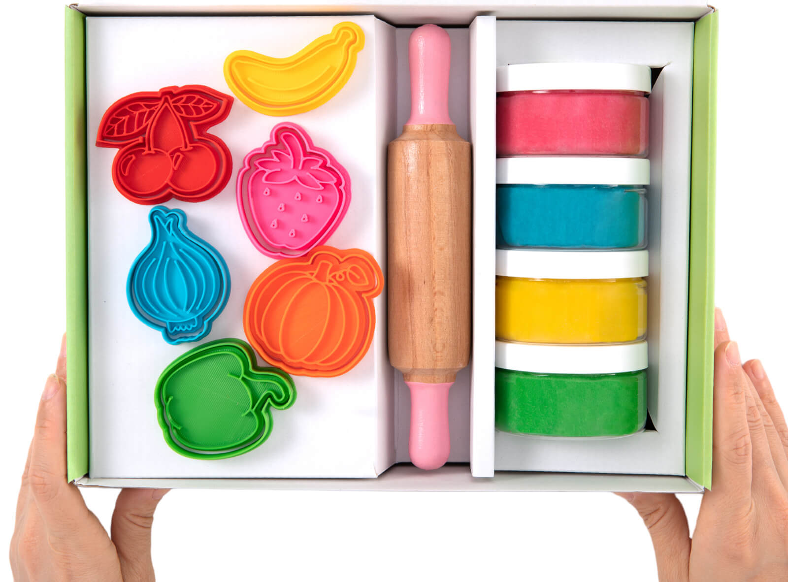 - 4 kolory ciastoliny (niebieski, żółty, zielony i różowy) wykonanej z wyłącznie naturalnych składników,