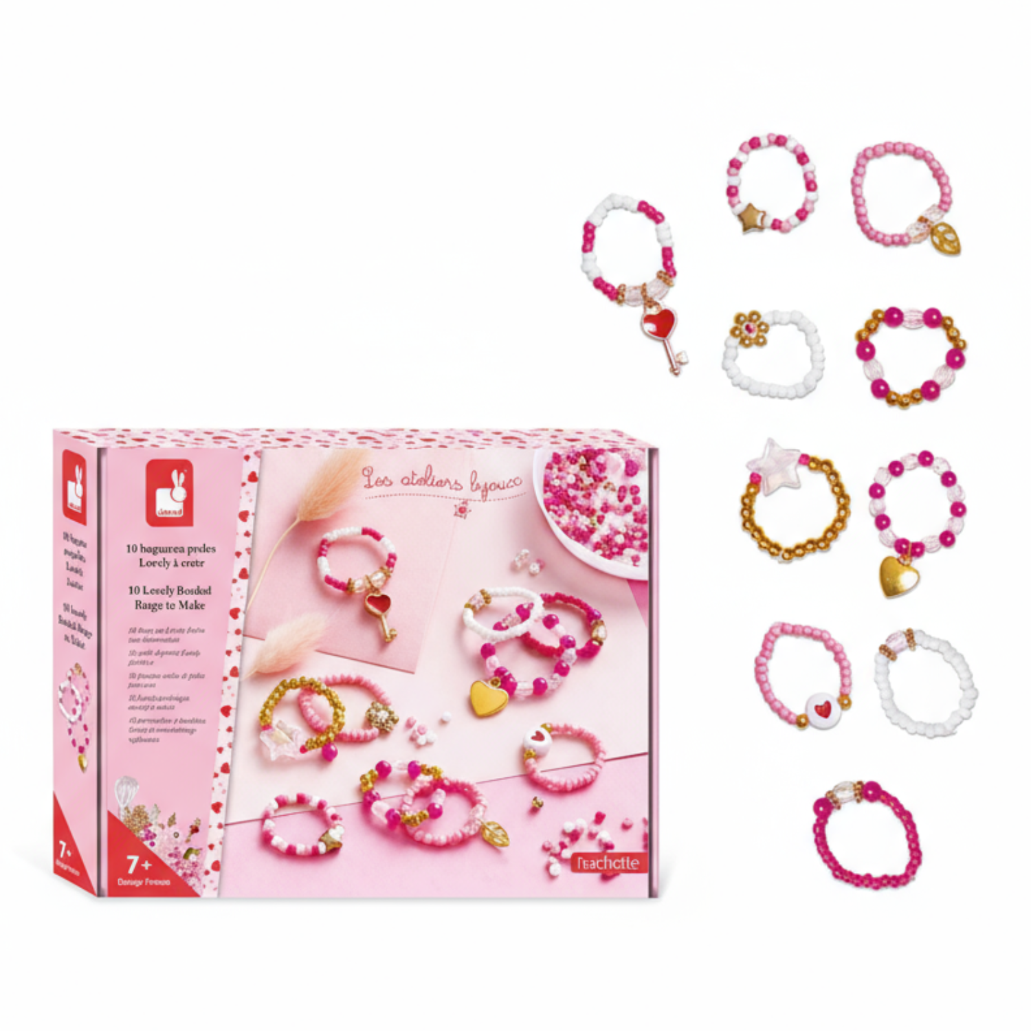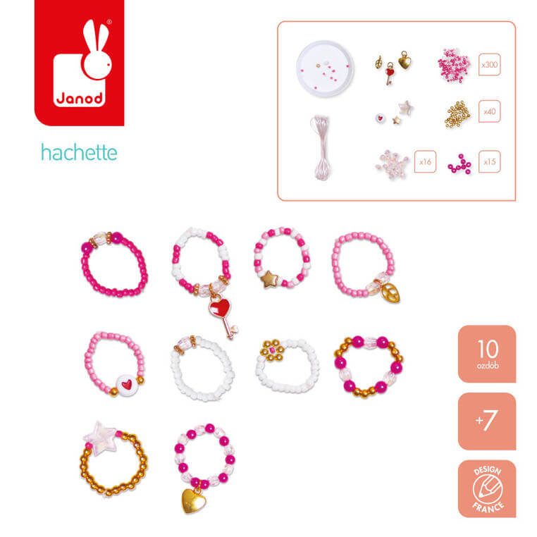 Pozwoli stworzyć w sumie aż 10 sztuk ozdób. W jego skład wchodzi 1 transparentna elastyczna żyłka, koraliki: 300 białych i różowych, 40 złotych, 15 w kolorze magenta i 16 jasnoróżowych przeźroczystych, a także 2 koralki-gwiazdki i 1 okrągły z serduszkiem, 3 złote zawieszki – serce, klucz i liść oraz podstawka, ułatwiająca pracę z tak drobnymi elementami. W kilka chwil Twoje dziecko może stać się kreatywnym jubilerem! Projektowanie i tworzenie biżuterii to godziny angażującej i jednocześnie uspokajającej, wyciszającej zabawy, a po skończonej pracy powstałe dzieła mogą jeszcze długo służyć jako ozdoby lub podarunki dla bliskich. Do zestawu dołączona jest szczegółowa instrukcja jak wykonać poszczególne ozdoby. Zestaw zaprojektowano we Francji we współpracy z francuską grupą mediową i wydawniczą Hachette. Zapakowany jest w stylowe kartonowe pudełko. Idealnie nadaje się na prezent.