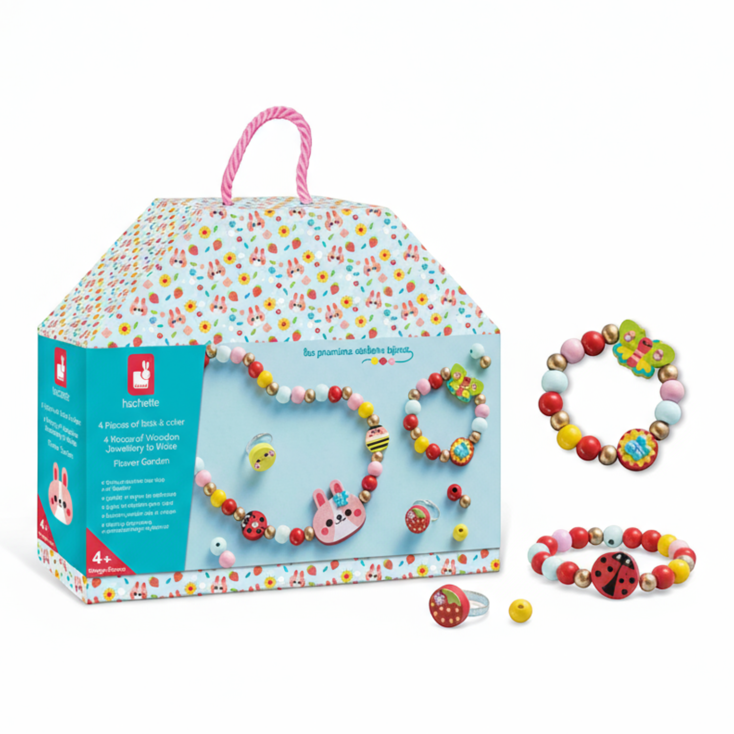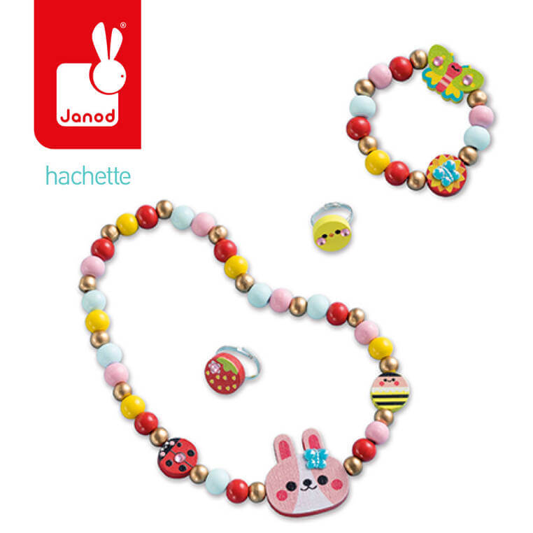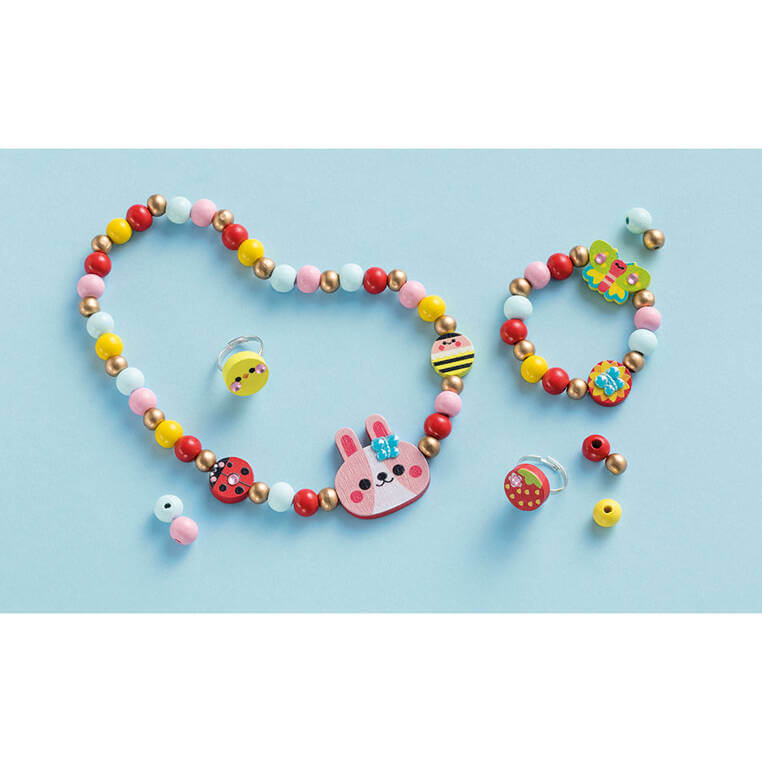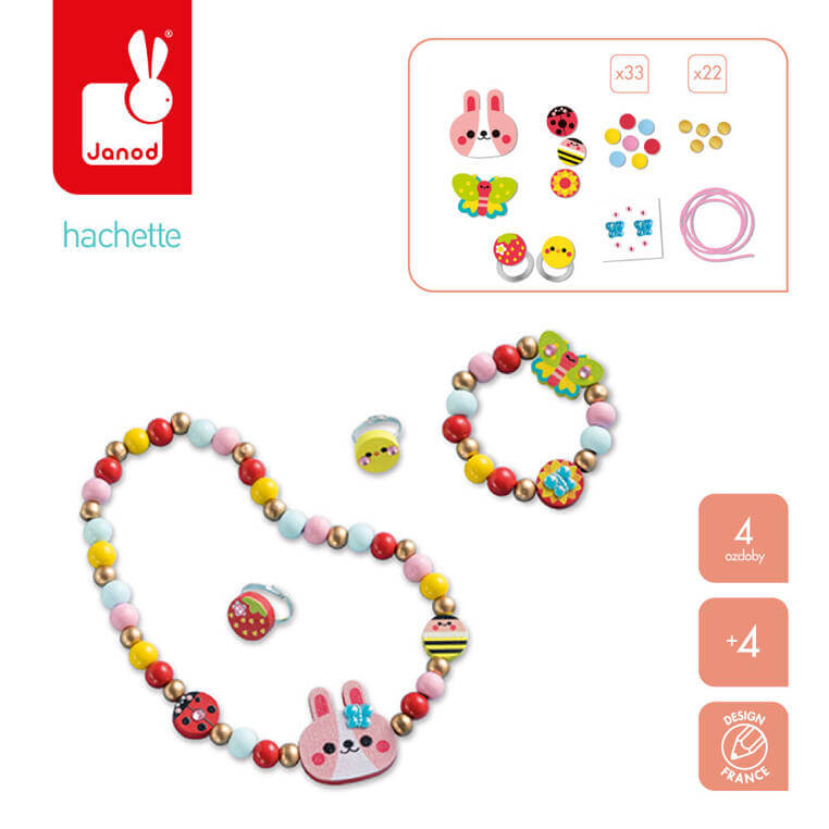 Pozwoli stworzyć łącznie 4 sztuki biżuterii – bransoletkę, naszyjnik i dwa pierścionki z drewnianych koralików. W jego skład wchodzi elastyczny sznurek do nawlekania elementów, dwa duże kształty – zajączek i motyl, 3 mniejsze okrągłe elementy z grafikami owadów, 33 kolorowe i 22 złote drewniane koraliki, 2 regulowane pierścionki i arkusik z naklejkami. Do zestawu dołączona jest szczegółowa instrukcja jak krok po kroku wykonać poszczególne ozdoby. Dzięki niej w kilka chwil Twoje dziecko może stać się kreatywnym jubilerem! Projektowanie i tworzenie biżuterii to długie godziny angażującej i jednocześnie uspokajającej, wyciszającej zabawy, a po skończonej pracy powstałe dzieła mogą jeszcze długo służyć jako ozdoby lub podarunki dla bliskich.