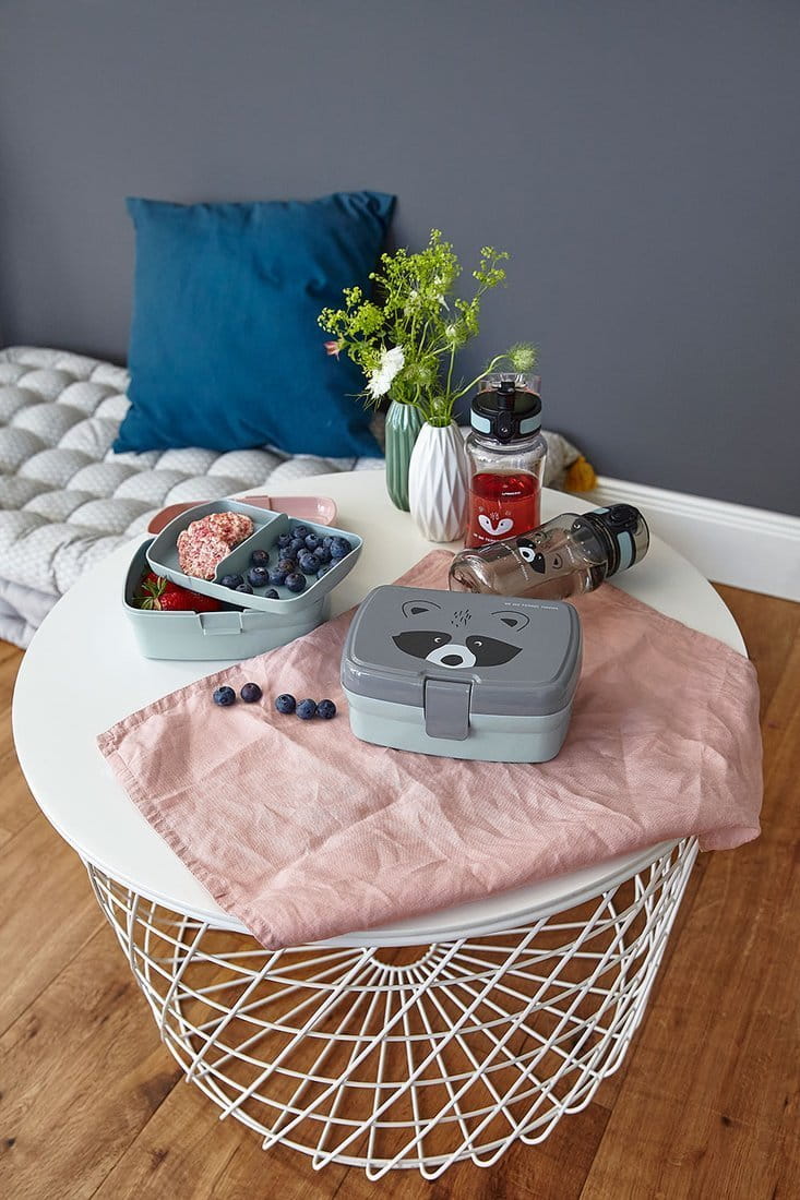 Zestaw przyda się do przedszkola lub szkoły, podczas spacerów, treningów i wycieczek. Pojemniki są lekkie, solidne i szczelne. Mają ergonomiczny kształt i zmieszczą się nawet do małego plecaka czy torby. Jasno turkusowy lunchbox ma popielatą pokrywkę z grafiką słodkiego szopa. Ta sama mordka znajduje się także na bidonie.