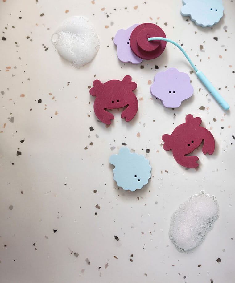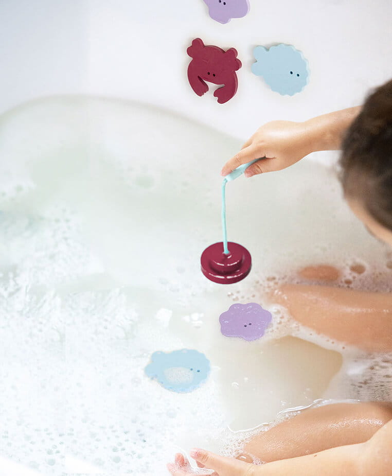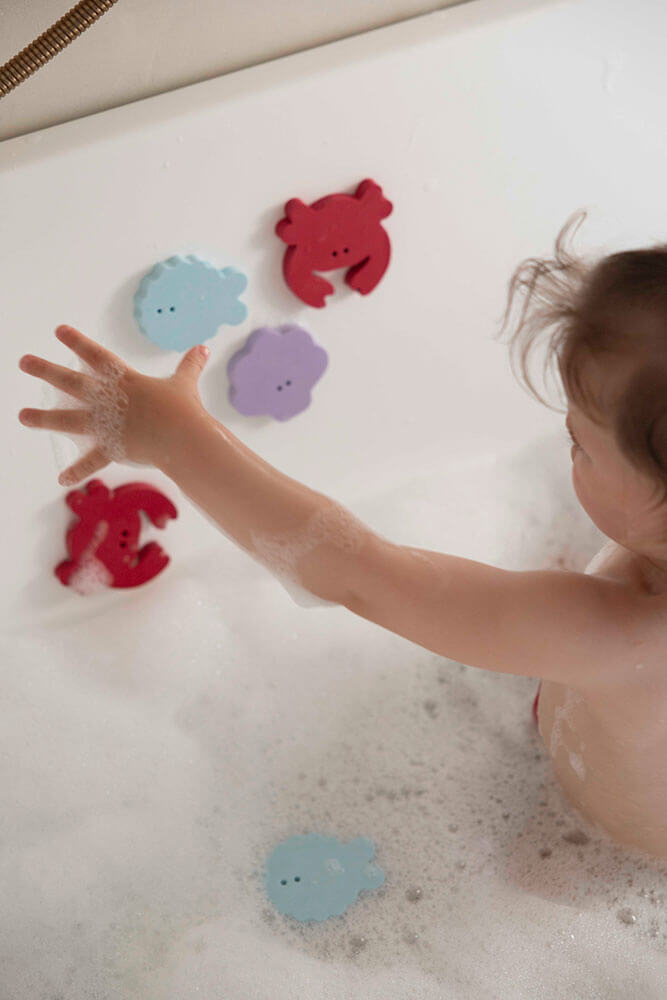 Zestaw składa się z 9 elementów – 8 kolorowych naklejek w kształcie morskich stworzeń oraz wędki, czyli sznurka z silikonową rączką i piankowym krążkiem na końcu. Wszystkie elementy wykonane są z lekkiej, unoszącej się na wodzie i szybkoschnącej pianki EVA. Po zamoczeniu elementy można przyczepiać do ścian wanny lub łazienkowych płytek (od ok. 10. miesiąca życia), a także wyławiać z wody za pomocą wędki (od ok. 18. miesiąca życia). Zestaw naklejek do kąpieli wspiera rozwój małej motoryki, koordynacji ręka–oko oraz kreatywności.