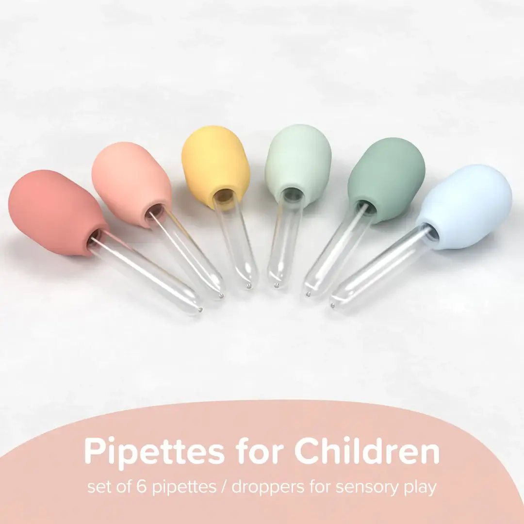- Bezpieczne materiały: Wykonane z wysokiej jakości, miękkiego silikonu spożywczego, te pipety są całkowicie bezpieczne dla Twojego dziecka. Nie zawierają BPA, PVC ani ftalanów, co gwarantuje beztroską zabawę.
