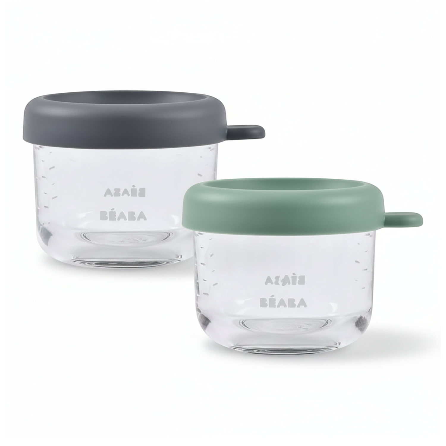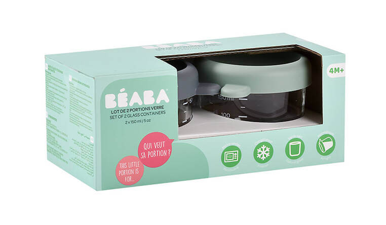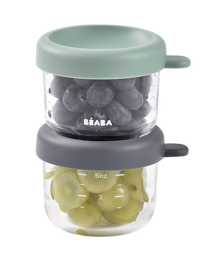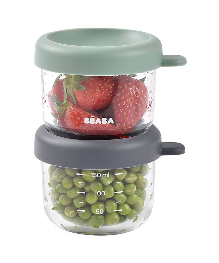 Zestaw dwóch słoiczków do przechowywania jedzenia francuskiej marki BEABA o pojemności 150 ml każdy, wykonanych z najwyższej jakości szkła