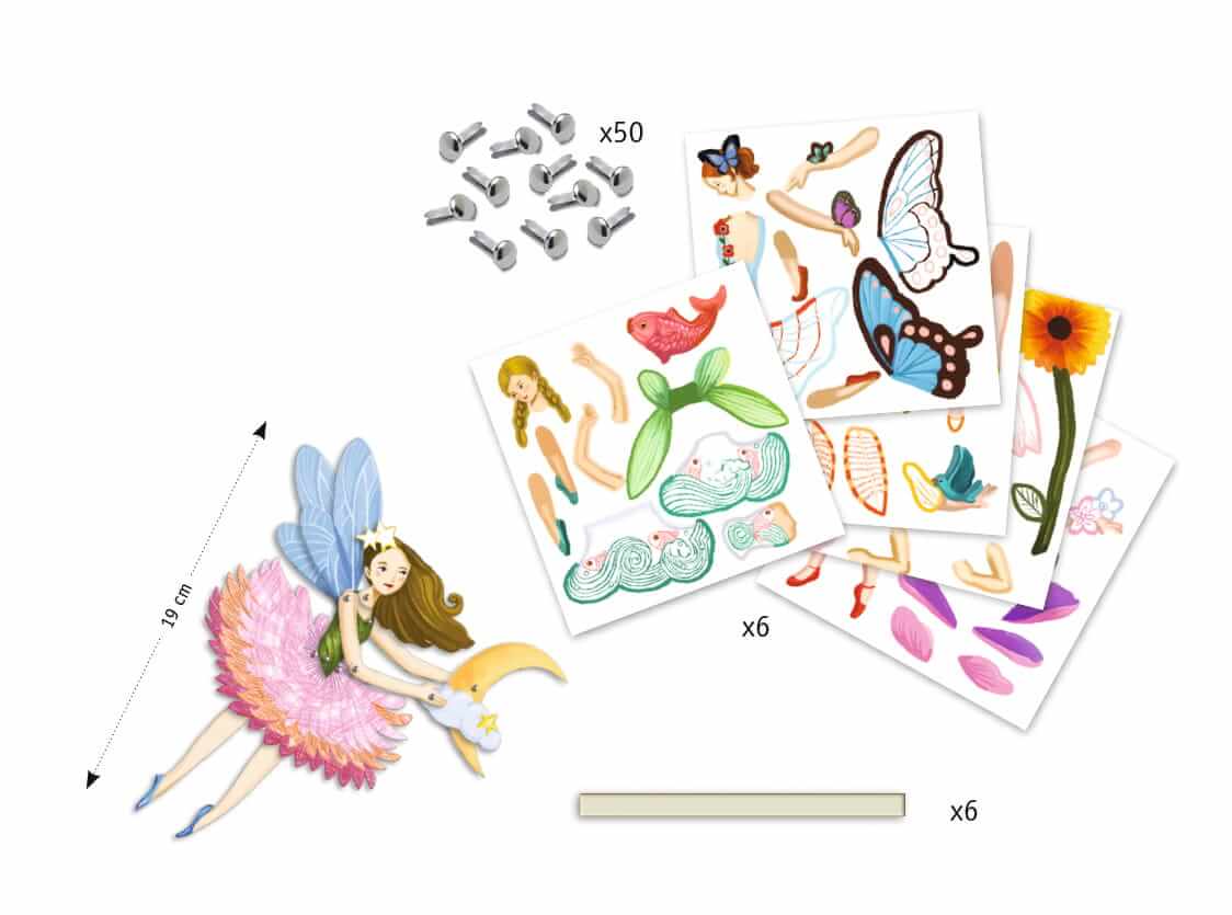 Zestaw artystyczny, w którym należy pokolorować poszczególne elementy każdej postaci kukiełki (tancerki , elfy) a następnie połączyć elementy przy pomocy klipsów aby otrzymać ruchomą postać.