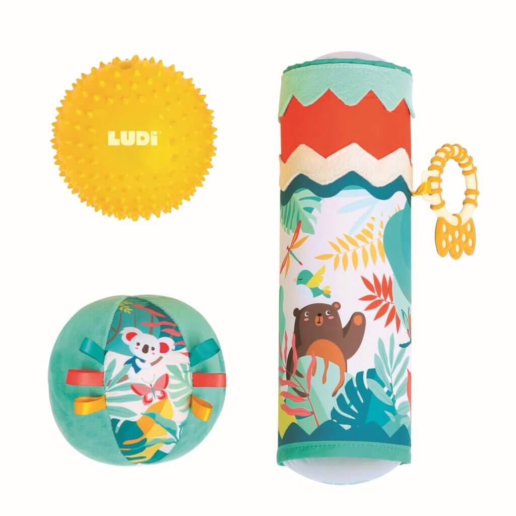 Zestaw trzech zabawek, które dostarczają bodźców sensorycznych i rozwijają motorykę dziecka: