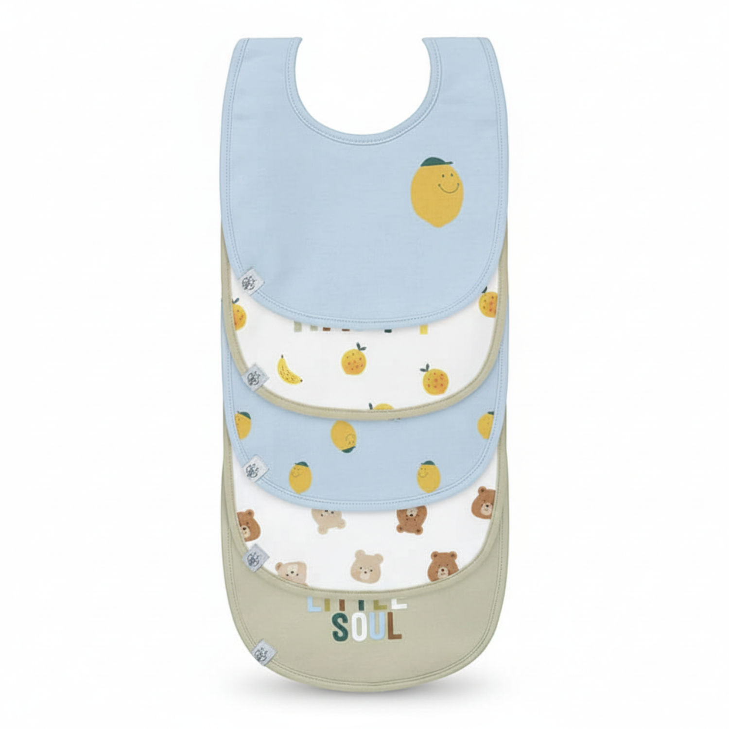 Każdy inny: dwa jasnoniebieskie z motywem uśmiechniętej cytrynki, szary z napisem HAPPY LITTLE SOUL, biały z motywem uśmiechniętej gruszki oraz biały z kolorowym napisem HAPPY. Wodoodporne, bezpieczne, przydatne przy karmieniu oraz pierwszych samodzielnych posiłkach. Zapięcie na rzep zapewnia komfort użytkowania.