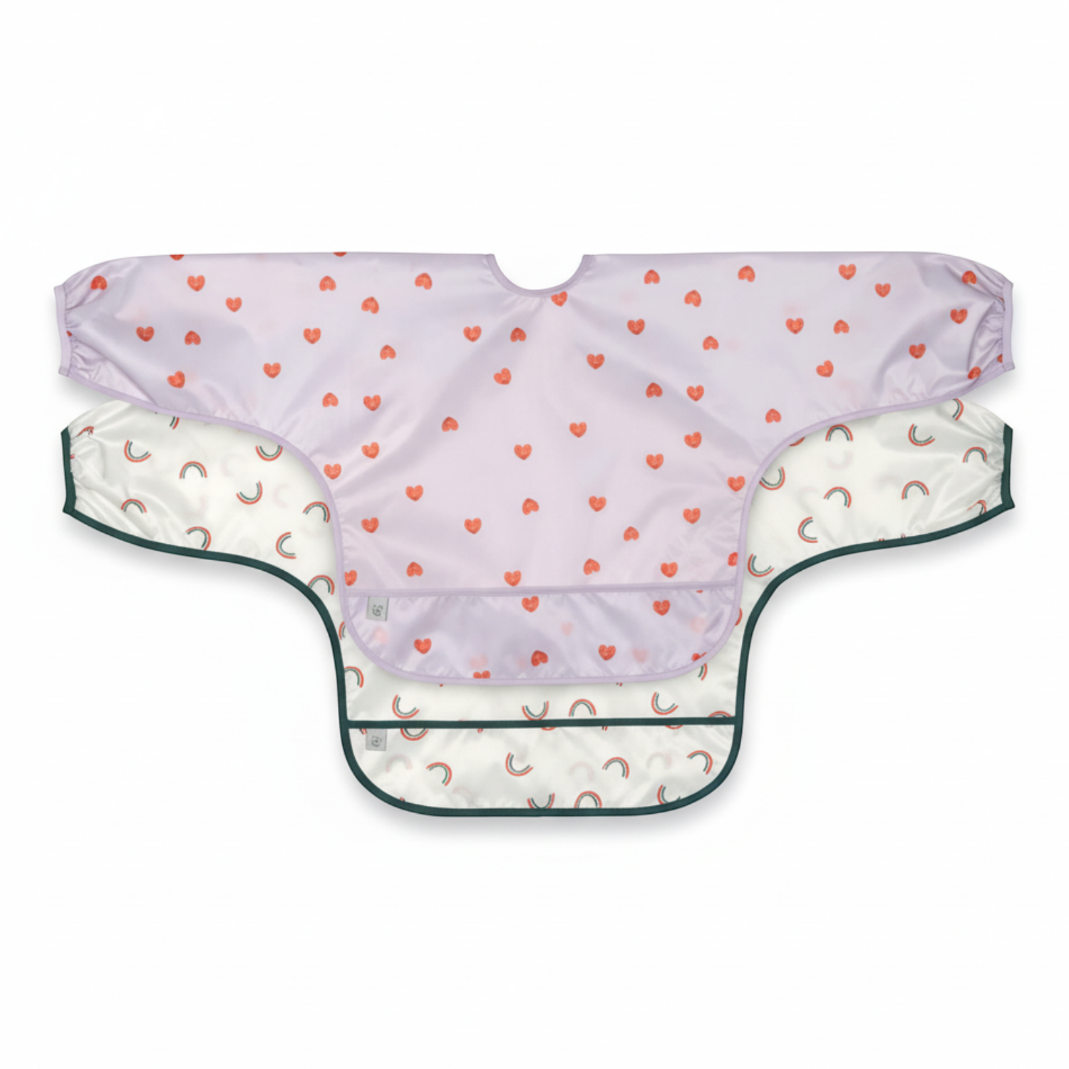 Są duże, wykonane z wodoodpornego tworzywa – jeden jasno lawendowy w czerwone uśmiechnięte serduszka, drugi jasny z ciemnozielonym obszyciem w multiprint z tęczą. Mają długie rękawy, miękką taśmę i wiązanie na tasiemki, a na dole funkcjonalną kieszonkę. Przeznaczone są dla dzieci od 6. do 24. miesiąca życia. Sprawdzą się nie tylko podczas karmienia malucha, ale też przy każdej twórczej aktywności dziecka: malowaniu, lepieniu z gliny, zabaw plasteliną czy prób samodzielnego przygotowania posiłku. Wygodne, nie krępują ruchów, dobrze przylegają do ubrań. Stanowią część większej kolekcji Happy Rascals. Możesz dobrać do nich inny produkt w tej samej gamie kolorystycznej lub z tym samym motywem.