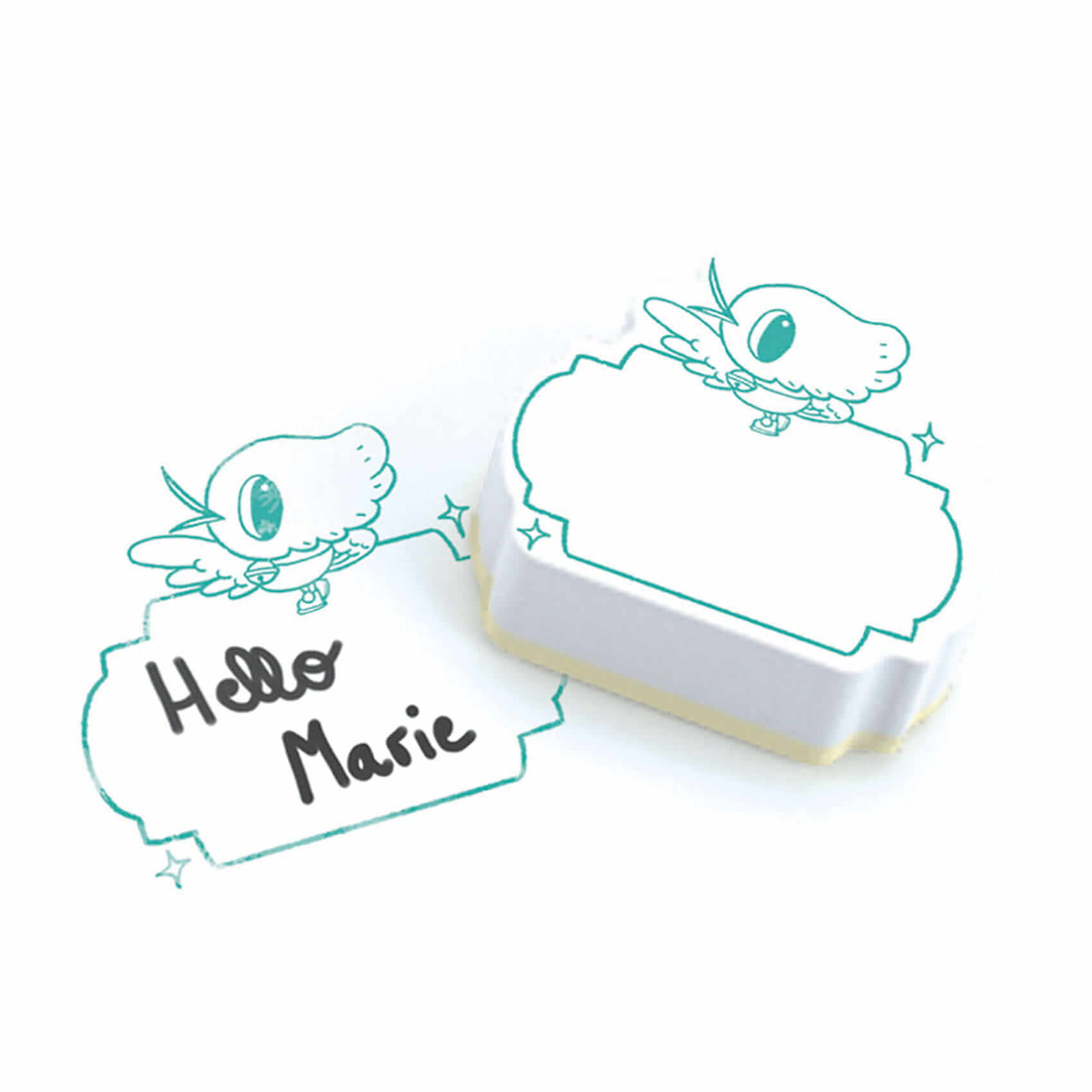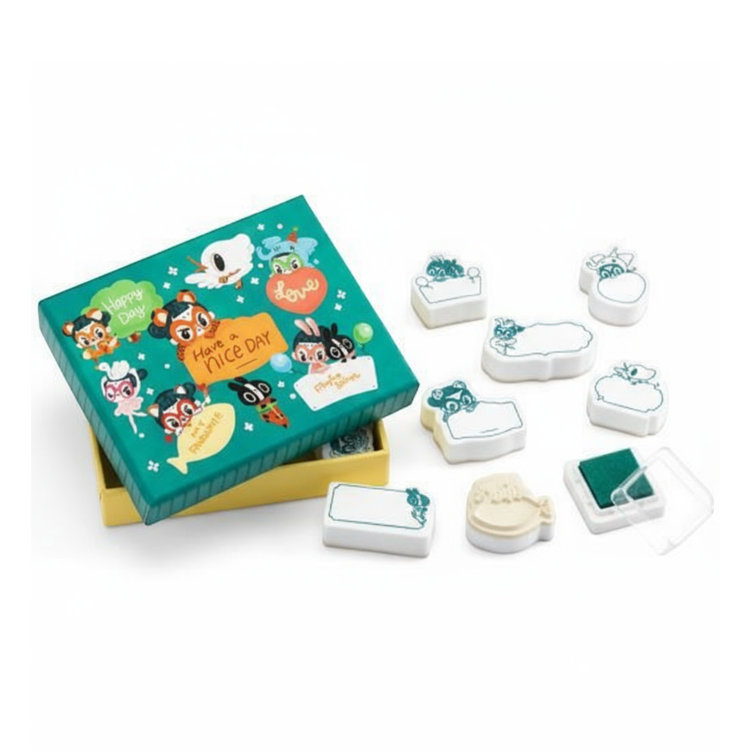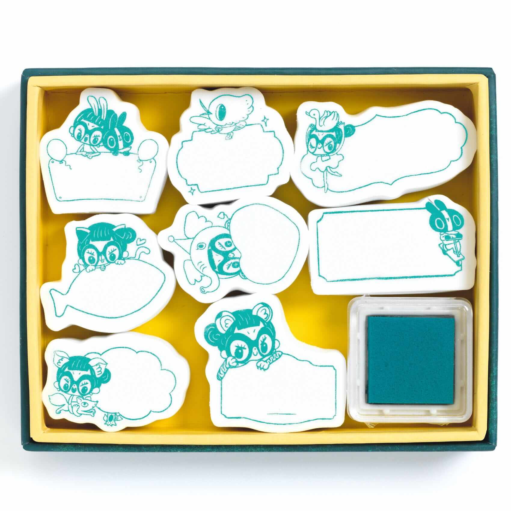 Ilustrowane pudełko zawierające 8 piankowych stempli oraz poduszeczkę z tuszem. Po odbiciu stempla, w okienku wystarczy napisać spersonalizowaną wiadomość.
