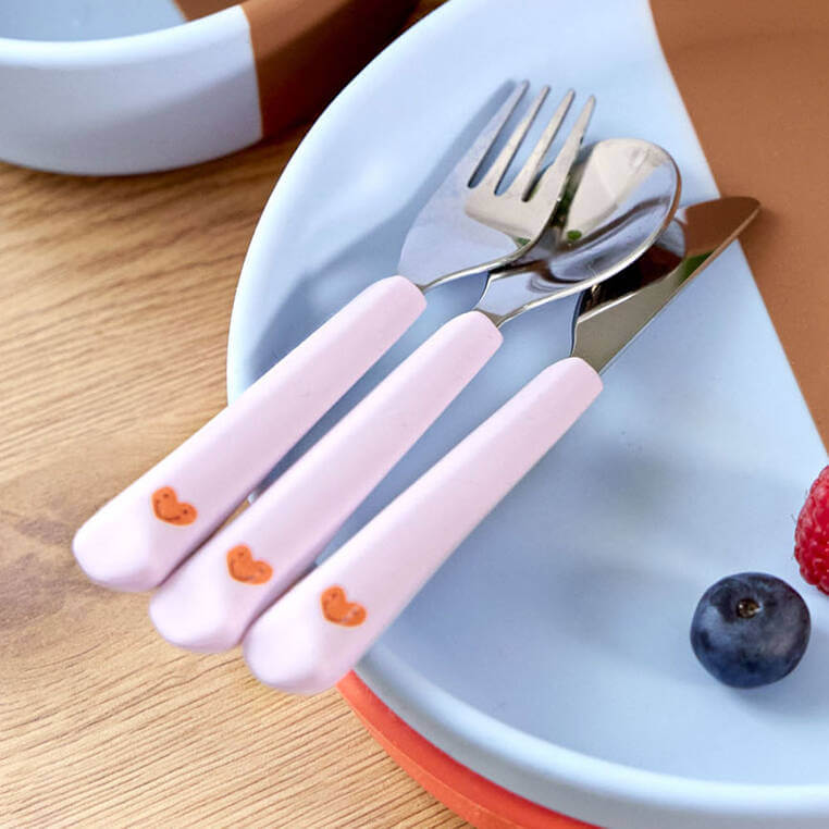 Są lekkie i mają specjalnie profilowane kształty, co ułatwia dzieciom nabieranie pożywienia. Jasno lawendowa rękojeść z silikonu z czerwoną grafiką uśmiechniętego serduszka zaprojektowana została tak, by idealnie pasować do dziecięcej rączki. Jej ergonomiczny kształt sprawia, że łatwo ją złapać i utrzymać, co wspiera rozwój samodzielności malucha.