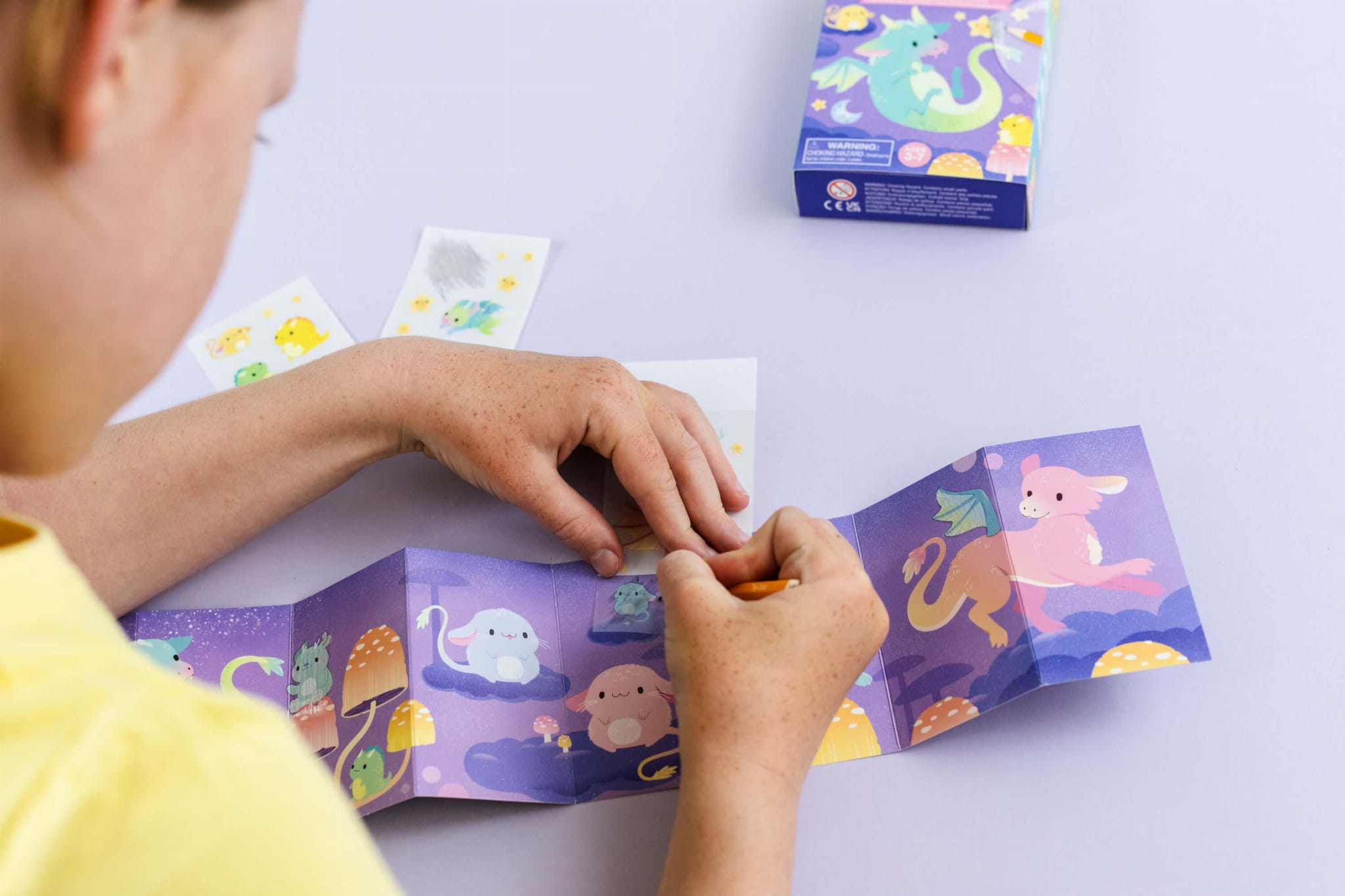 Skład zestawu: 1x plansza z postaciami (składana w harmonijkę), 3x arkusze kolorowych kalkomanii, 1x ołówek.