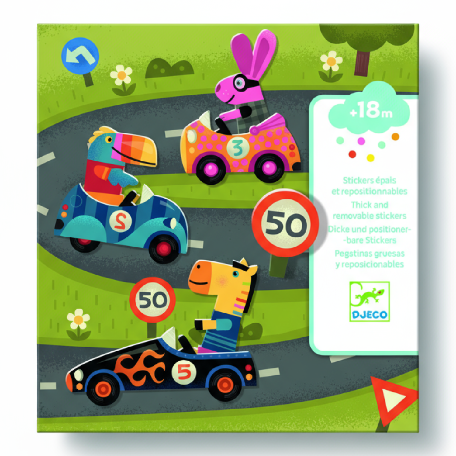 Zestaw artystyczny „AUTA” to książeczka z naklejkami wielokrotnego użytku. Zestaw jest w kształcie książeczki ( ma podwójne strony o szerokości 43 cm po rozłożeniu) z grafiką toru wyścigowego i 11 naklejkami w kpl. Dzieci będą mogły ozdabiać ilustracje i komponować niezliczone sceny wyścigów samochodowych. Naklejki łatwe do swobodnego załapania, naklejania i odklejania.