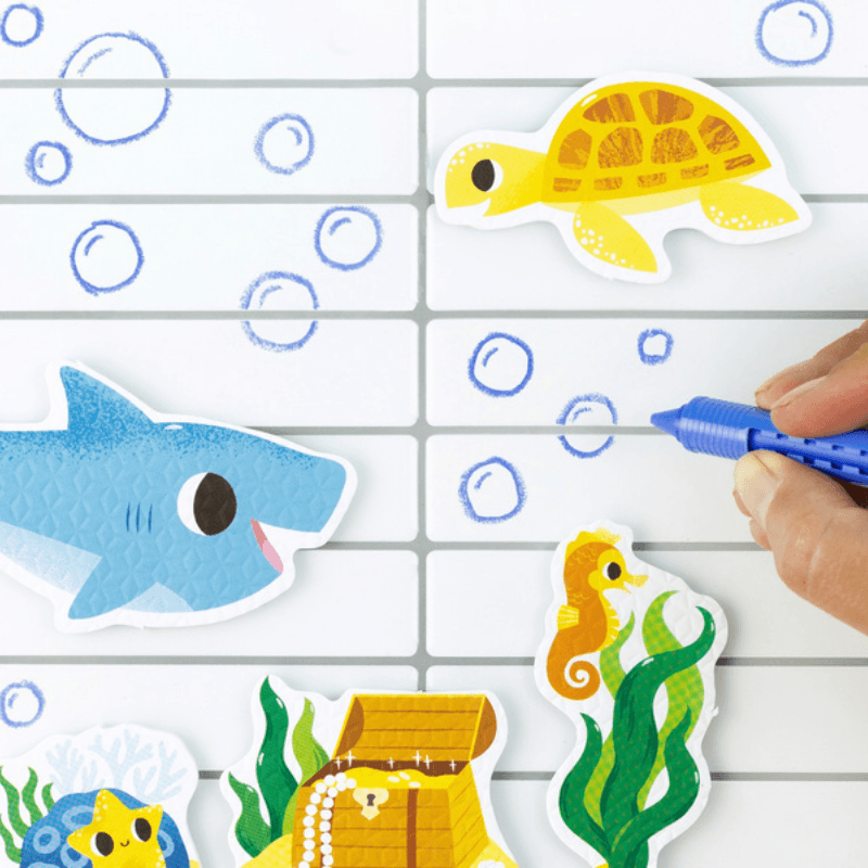 - 17 piankowych naklejek – kolorowe kształty wykonane z pianki EVA, które po namoczeniu przywierają do powierzchni wanny i kafelków, pozwalając na tworzenie nieskończonych opowieści.