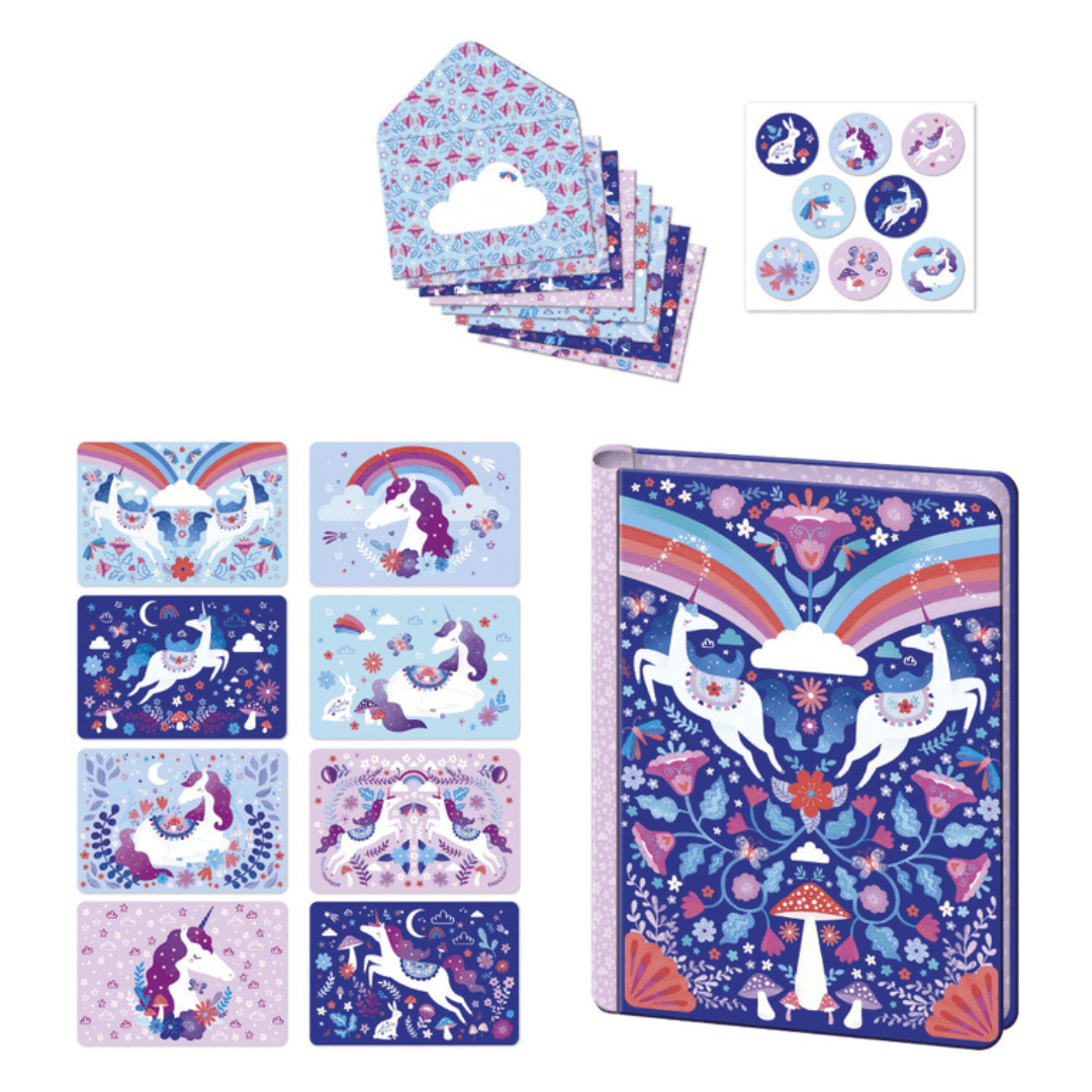 8 kart-zaproszeń z grafiką jednorożców na kwiatowych tłach, a także 8 kopert i 8 okrągłych naklejek. Całość zapakowana jest w piękne książkowe pudełko z kieszonkami.